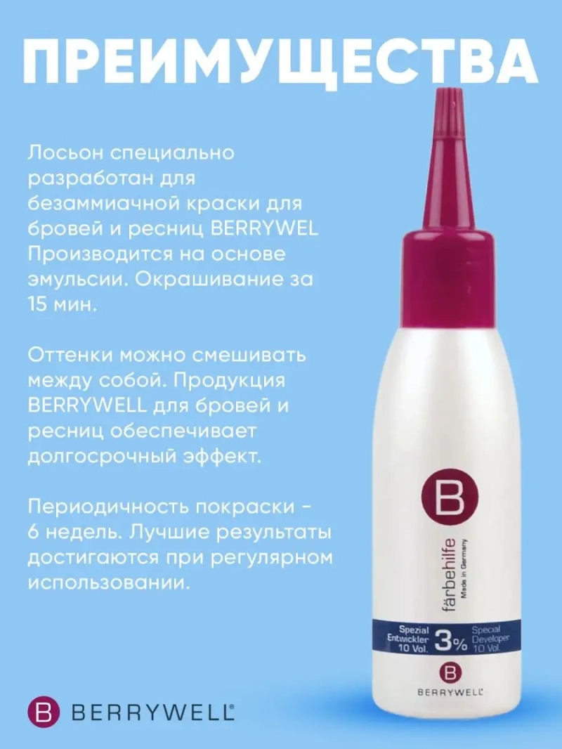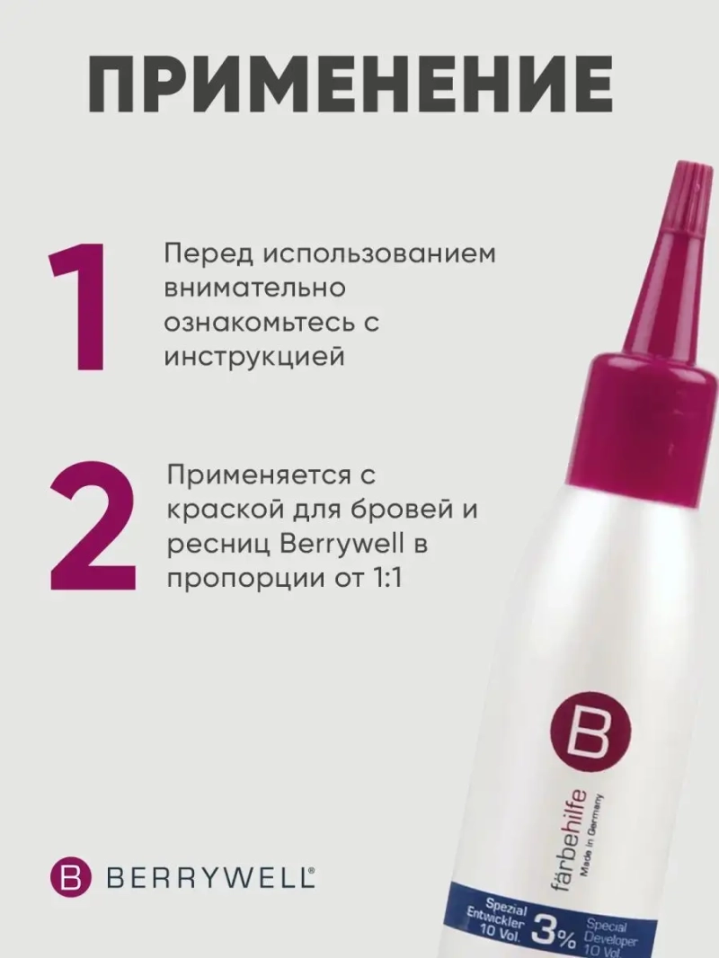 Окислитель для бровей BERRYWELL 3% 61 мл. Специально разработан для безаммиачной краски для бровей и ресниц. Содержит 3% перекись водорода. Окрашивание за 15 мин.Оттенки можно смешивать между собой.Продукция BERRYWELL для бровей и ресниц обеспечивает долгосрочный эффект.Периодичность покраски - 6 недель.Лучшие результаты достигаются при регулярном использовании.