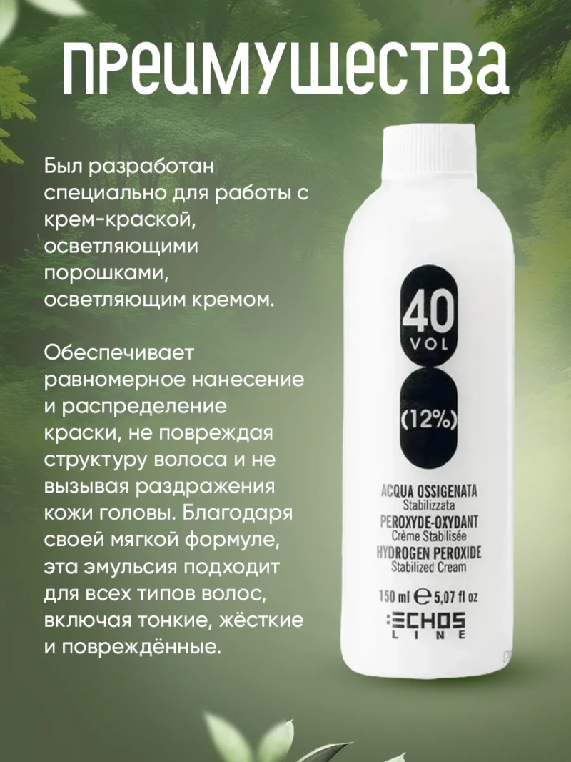 Крем-окислитель Echosline с пероксидом водорода был разработан специально для работы с крем-краской, осветляющими порошками, осветляющим кремом.
