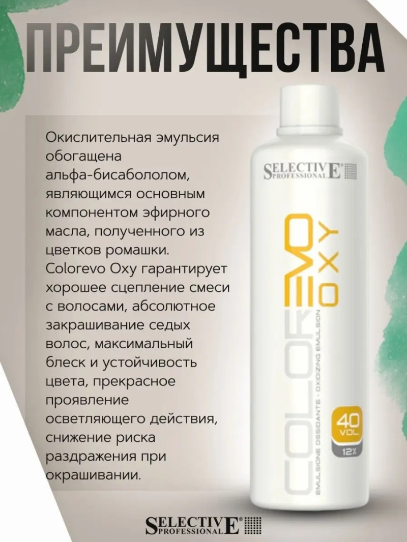 Оксигент "ColorEVO" 12% (40vol) эмульсия окислительная 1000 мл. Формула Colorevo Oxy разработана для совместного применения с красителем ColorEVO и EvoGlitch для наилучших результатов окрашивания. Окислительная эмульсия обогащена альфа-бисабололом, являющимся основным компонентом эфирного масла, полученного из цветков ромашки. Colorevo Oxy гарантирует хорошее сцепление смеси с волосами, абсолютное закрашивание седых волос, максимальный блеск и устойчивость цвета, прекрасное проявление осветляющего действия, снижение риска раздражения при окрашивании. Применение: Перед использованием внимательно ознакомьтесь с инструкцией. Смешивать краску и оксигент необходимо только в неметаллической посуде.