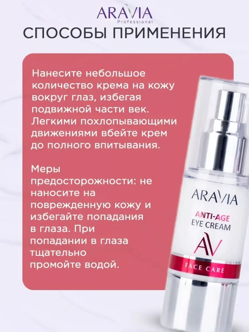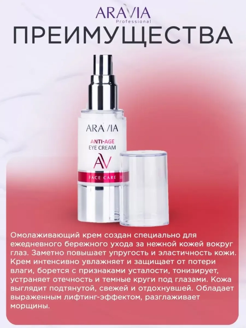 Омолаживающий крем для векAnti-Age Eye Cream. Омолаживающий крем создан специально для ежедневного бережного ухода за нежной кожей вокруг глаз. Заметно повышает упругость и эластичность кожи. Крем интенсивно увлажняет и защищает от потери влаги, борется с признаками усталости, тонизирует, устраняет отечность и темные круги под глазами. Кожа выглядит подтянутой, свежей и отдохнувшей. Обладает выраженным лифтинг-эффектом, разглаживает морщины. Кофеин оказывает мощное тонизирующее действие, устраняет припухлости, темные круги под глазами и следы усталости. Масло виноградных косточек глубоко проникает в кожу и способствует удержанию влаги. Помогает вернуть коже упругость, разглаживает морщины, устраняет вялость кожи, активизирует обмен веществ в клетках кожи. Сквалан увлажняет и смягчает кожу, защищает от негативного воздействия окружающей среды, борется с преждевременным старением и поддерживает эластичность кожи. ПРЕИМУЩЕСТВА: Кожа становится упругой и подтянутой