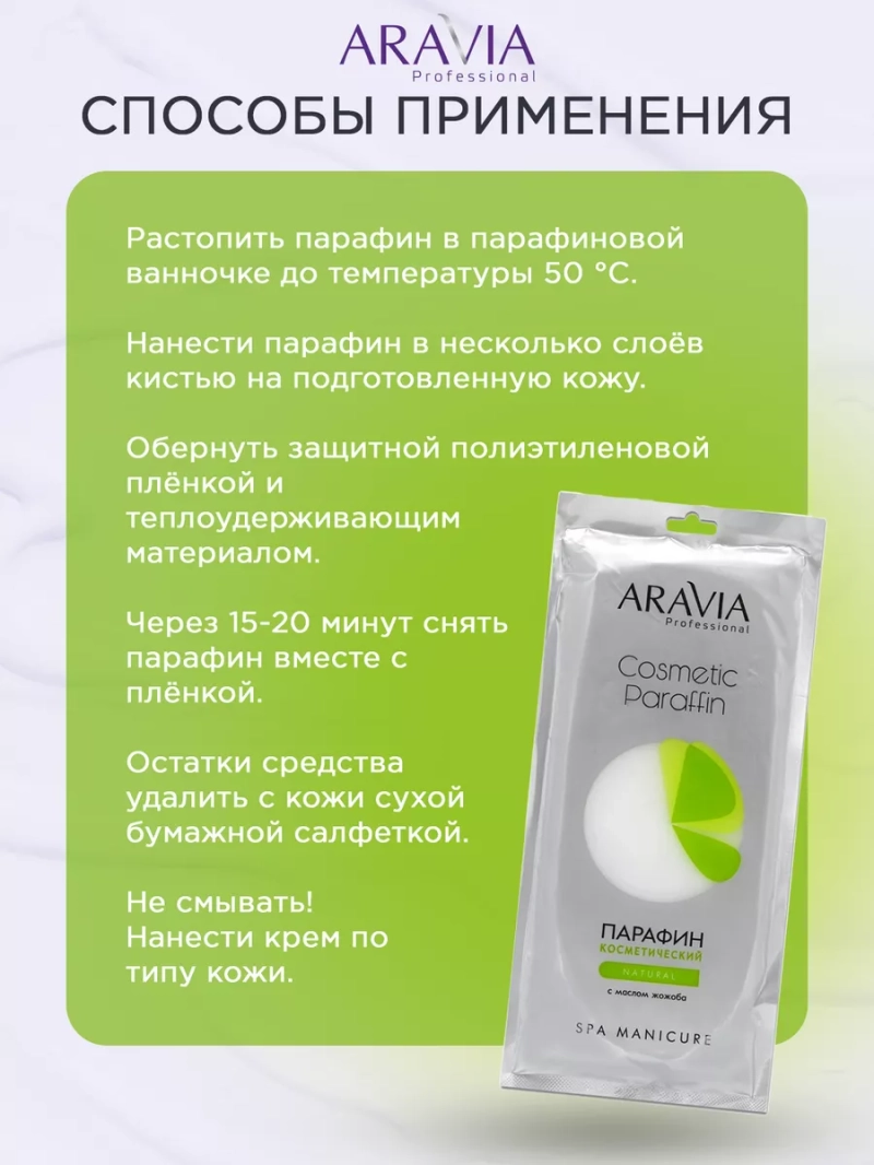 ПАРАФИН КОСМЕТИЧЕСКИЙ С МАСЛОМ ЖОЖОБА NATURAL, 500 Г. Парафин обогащен комплексом растительных масел и витамином Е, глубоко увлажняет кожу, делая её мягкой и шелковистой. Масло жожоба, входящее в состав, нормализует барьерные свойства кожи. Парафин способствует устранению сухости и стянутости, кожа становится более эластичной и упругой. Восстанавливает гидролипидный баланс кожи и образует защитную плёнку, удерживающую влагу и повышающую сопротивление негативным факторам окружающей среды. Рекомендуется для чувствительной кожи. Назначение: для процедуры парафинового ухода, интенсивный уход для рук и ног. Биоактивный состав: масло жожоба, витамин Е. Состав продукта (INCI): Paraffin, Simmondsia Chinensis (Jojoba) Seed Oil, Tocopheryl Acetate. СПОСОБ ПРИМЕНЕНИЯ: Растопить парафин в парафиновой ванночке до температуры 50 °С. Нанести парафин в несколько слоёв кистью на подготовленную кожу. Обернуть защитной полиэтиленовой плёнкой и теплоудерживающим материалом. Через 15-20 минут снять парафин вместе с плёнкой. Остатки средства удалить с кожи сухой бумажной салфеткой. Не смывать! Нанести крем по типу кожи. Меры предосторожности: не наносите на поврежденную кожу и избегайте попадания в глаза. При попадании в глаза тщательно промойте водой.
