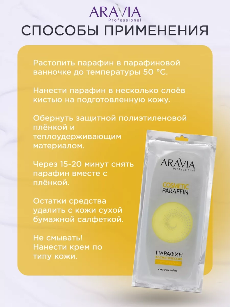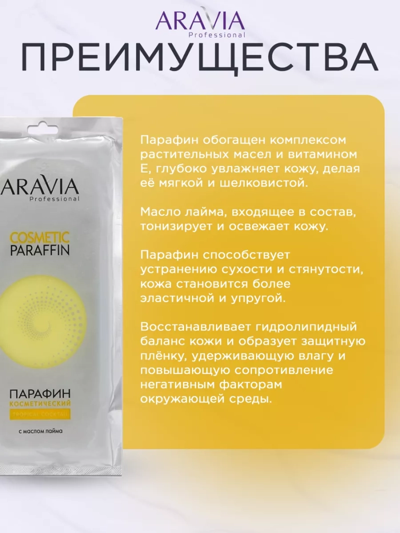 ПАРАФИН КОСМЕТИЧЕСКИЙ С МАСЛОМ ЛАЙМА TROPICAL COCKTAIL, 500 Г. Парафин обогащен комплексом растительных масел и витамином Е, глубоко увлажняет кожу, делая её мягкой и шелковистой. Масло лайма, входящее в состав, тонизирует и освежает кожу. Парафин способствует устранению сухости и стянутости, кожа становится более эластичной и упругой. Восстанавливает гидролипидный баланс кожи и образует защитную плёнку, удерживающую влагу и повышающую сопротивление негативным факторам окружающей среды. Назначение: для процедуры парафинового ухода, интенсивный уход для рук и/или ног. Биоактивный состав: масло персика, масло абрикосовых косточек, масло лайма, витамин Е. Состав продукта (INCI): Paraffin, Peach Oil, Apricot Kernel Oil, Prunus Armeniaca Oil, Citrus latifolia Oil, Tocopheryl Acetate, Parfume, Yellow № 11. СПОСОБ ПРИМЕНЕНИЯ: Растопить парафин в парафиновой ванночке до температуры 50 °С. Нанести на кожу до полного впитывания средство для интенсивного ухода: крем-флюид или сливки. Нанести парафин в несколько слоёв кистью на подготовленную кожу. Обернуть защитной полиэтиленовой плёнкой и теплоудерживающим материалом. Через 15-20 минут снять парафин вместе с плёнкой. Остатки средства удалить с кожи сухой бумажной салфеткой. Не смывать! При необходимости нанести завершающий крем. Для повышения эффективности проведения процедуры парафинового ухода на всех этапах рекомендуется использовать линейку профессиональных средств ARAVIA Professional. Меры предосторожности: не наносите на поврежденную кожу и избегайте попадания в глаза. При попадании в глаза тщательно промойте водой.