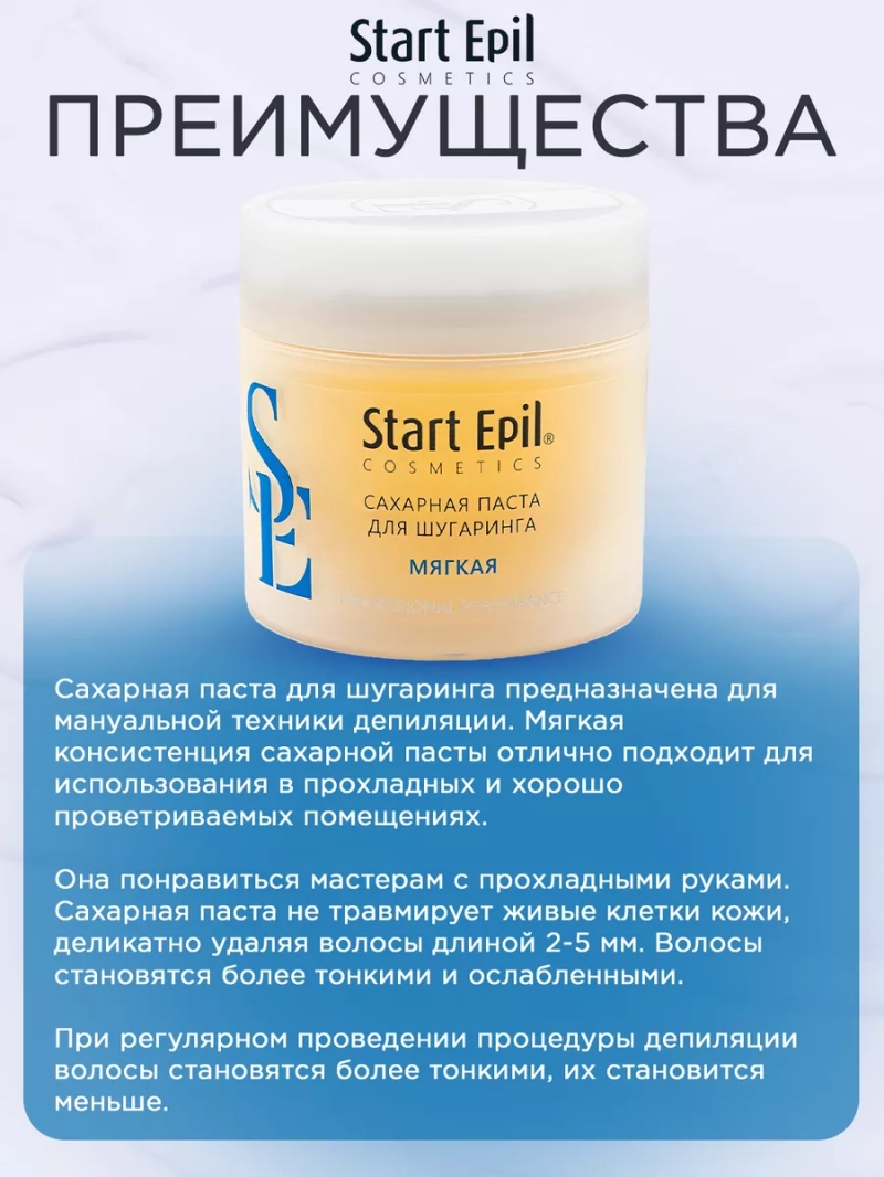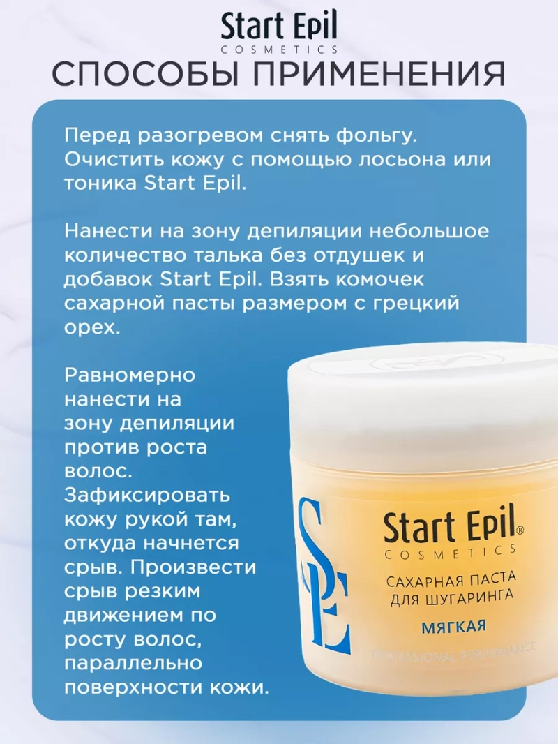 ПАСТА ДЛЯ ШУГАРИНГА «МЯГКАЯ», 400 Г. Сахарная паста для шугаринга предназначена для мануальной техники депиляции. Мягкая консистенция сахарной пасты отлично подходит для использования в прохладных и хорошо проветриваемых помещениях. Она понравиться мастерам с прохладными руками. Сахарная паста не травмирует живые клетки кожи, деликатно удаляя волосы длиной 2-5 мм. Волосы становятся более тонкими и ослабленными. Назначение: удаление нежелательных волос. Рекомендации для использования: для профессионального использования. СПОСОБ ПРИМЕНЕНИЯ: Перед разогревом снять фольгу. Очистить кожу с помощью лосьона или тоника Start Epil. Нанести на зону депиляции небольшое количество талька без отдушек и добавок Start Epil. Взять комочек сахарной пасты размером с грецкий орех. Равномерно нанести на зону депиляции против роста волос. Зафиксировать кожу рукой там, откуда начнется срыв. Произвести срыв резким движением по росту волос, параллельно поверхности кожи. Остатки сахарной пасты удалить термальной водой Start Epil и салфеткой. Завершить процедуру средствами для ухода за кожей: молочком увлажняющим или сливками восстанавливающими Start Epil. Меры предосторожности: не наносите на поврежденную кожу и избегайте попадания в глаза. При попадании в глаза тщательно промойте водой. Перед применением тестируйте на небольшом участке кожи.