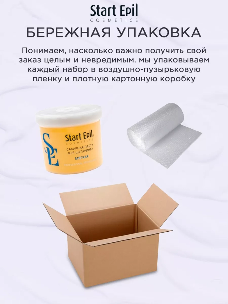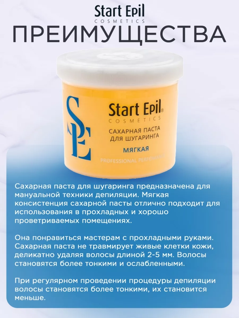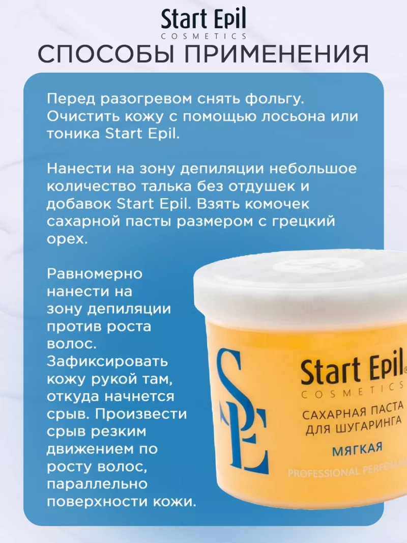 ПАСТА ДЛЯ ШУГАРИНГА «МЯГКАЯ», 750 Г. Сахарная паста для шугаринга предназначена для мануальной техники депиляции. Мягкая консистенция сахарной пасты отлично подходит для использования в прохладных и хорошо проветриваемых помещениях. Она понравиться мастерам с прохладными руками. Сахарная паста не травмирует живые клетки кожи, деликатно удаляя волосы длиной 2-5 мм. Волосы становятся более тонкими и ослабленными. При регулярном проведении процедуры депиляции волосы становятся более тонкими, их становится меньше. Процедура со временем становится менее болезненной. Назначение: удаление нежелательных волос. Рекомендации для использования: для профессионального использования. СПОСОБ ПРИМЕНЕНИЯ: Перед разогревом снять фольгу. Очистить кожу с помощью лосьона или тоника Start Epil. Нанести на зону депиляции небольшое количество талька без отдушек и добавок Start Epil. Взять комочек сахарной пасты размером с грецкий орех. Равномерно нанести на зону депиляции против роста волос. Зафиксировать кожу рукой там, откуда начнется срыв. Произвести срыв резким движением по росту волос, параллельно поверхности кожи. Остатки сахарной пасты удалить термальной водой Start Epil и салфеткой.Завершить процедуру средствами для ухода за кожей: молочком увлажняющим или сливками восстанавливающими Start Epil. Меры предосторожности: не наносите на поврежденную кожу и избегайте попадания в глаза. При попадании в глаза тщательно промойте водой. Перед применением тестируйте на небольшом участке кожи.