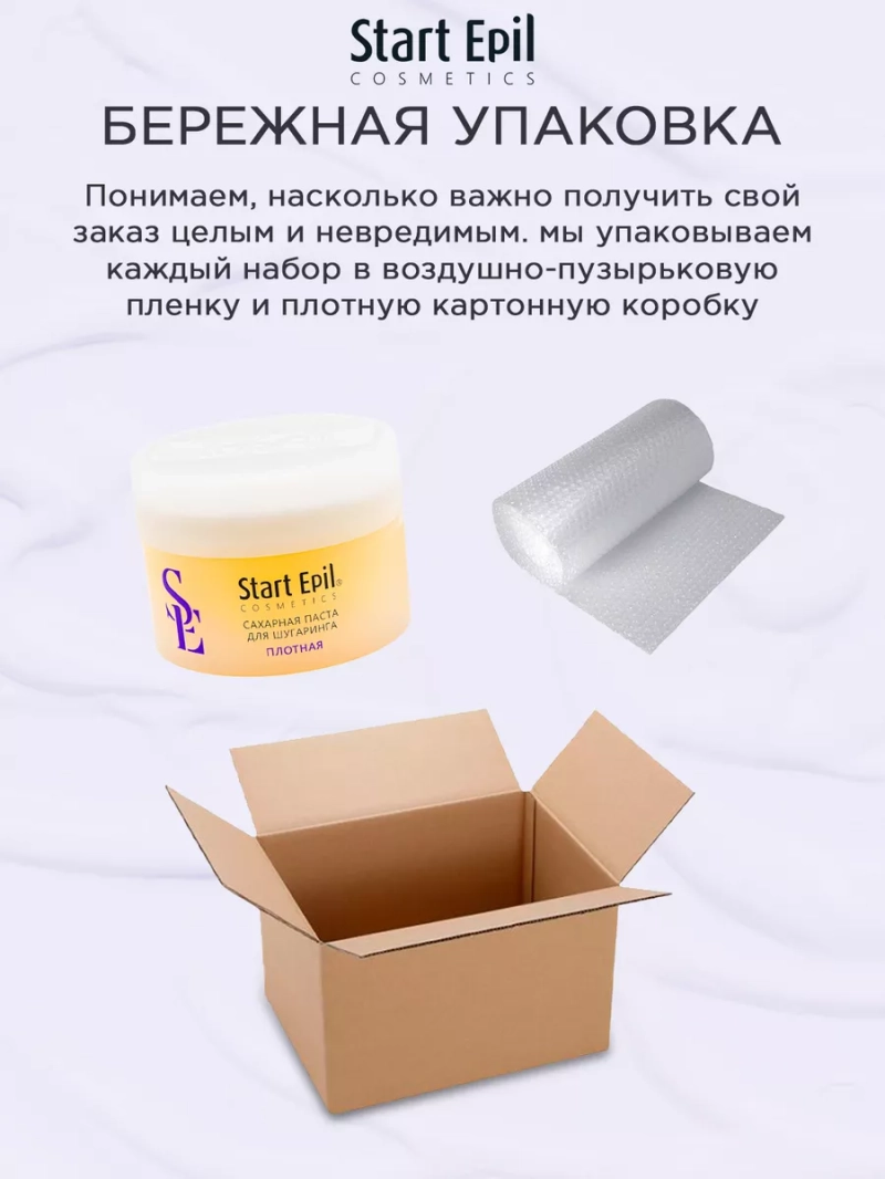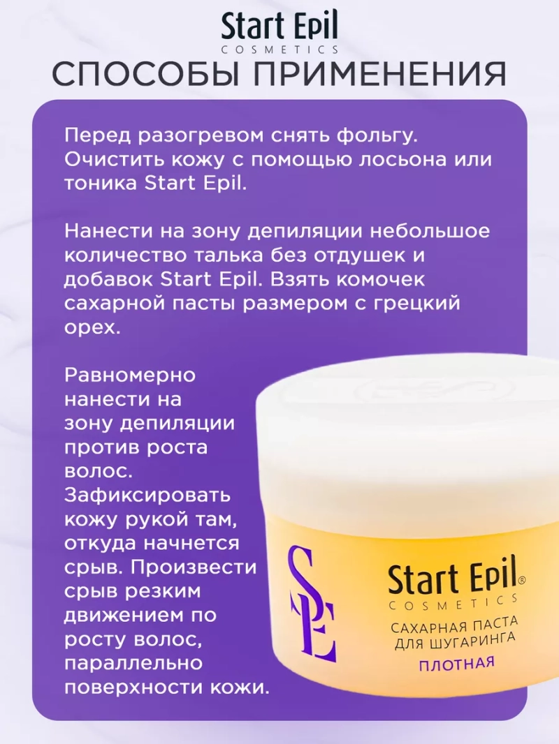 ПАСТА ДЛЯ ШУГАРИНГА «ПЛОТНАЯ», 200 Г. Сахарная паста для шугаринга предназначена для мануальной техники депиляции. Рабочая температура 37-40°С. Также ее можно добавлять для смешивания с другими сахарными пастами с целью достижения требуемой консистенции с учётом условий окружающей среды, температуры рук мастера, типа кожи и жесткости волос у клиента. Сахарная паста не травмирует живые клетки кожи, деликатно удаляя волосы длиной 2-5 мм. Волосы становятся более тонкими и ослабленными. При регулярном проведении процедуры депиляции волосы становятся более тонкими, их становится меньше. Процедура со временем становится менее болезненной. Назначение: удаление нежелательных волос. Рекомендации для использования: для профессионального использования. СПОСОБ ПРИМЕНЕНИЯ: Перед разогревом снять фольгу. Очистить кожу с помощью лосьона или тоника Start Epil. Нанести на зону депиляции небольшое количество талька без отдушек и добавок Start Epil. Взять комочек сахарной пасты размером с грецкий орех. Равномерно нанести на зону депиляции против роста волос. Зафиксировать кожу рукой там, откуда начнется срыв. Произвести срыв резким движением по росту волос, параллельно поверхности кожи. Остатки сахарной пасты удалить термальной водой Start Epil и салфеткой. Завершить процедуру средствами для ухода за кожей: молочком увлажняющим или сливками восстанавливающими Start Epil. Меры предосторожности: не наносите на поврежденную кожу и избегайте попадания в глаза. При попадании в глаза тщательно промойте водой. Перед применением тестируйте на небольшом участке кожи.