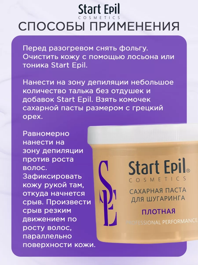 ПАСТА ДЛЯ ШУГАРИНГА «ПЛОТНАЯ», 400 Г. Сахарная паста для шугаринга предназначена для мануальной техники депиляции, рабочая температура составляет 37-40°C. Также ее можно добавлять для смешивания с другими сахарными пастами с целью достижения требуемой консистенции с учётом условий окружающей среды, температуры рук мастера, типа кожи и жесткости волос у клиента. Сахарная паста не травмирует живые клетки кожи, деликатно удаляя волосы длиной 2-5 мм. Волосы становятся более тонкими и ослабленными. При регулярном проведении процедуры депиляции волосы становятся более тонкими, их становится меньше. Процедура со временем становится менее болезненной. Назначение: удаление нежелательных волос. Рекомендации для использования: для профессионального использования. СПОСОБ ПРИМЕНЕНИЯ: Перед разогревом снять фольгу. Очистить кожу с помощью лосьона или тоника Start Epil. Нанести на зону депиляции небольшое количество талька без отдушек и добавок Start Epil. Взять комочек сахарной пасты размером с грецкий орех. Равномерно нанести на зону депиляции против роста волос. Зафиксировать кожу рукой там, откуда начнется срыв. Произвести срыв резким движением по росту волос, параллельно поверхности кожи. Остатки сахарной пасты удалить термальной водой Start Epil и салфеткой. Завершить процедуру средствами для ухода за кожей: молочком увлажняющим или сливками восстанавливающими Start Epil. Меры предосторожности: не наносите на поврежденную кожу и избегайте попадания в глаза. При попадании в глаза тщательно промойте водой. Перед применением тестируйте на небольшом участке кожи.