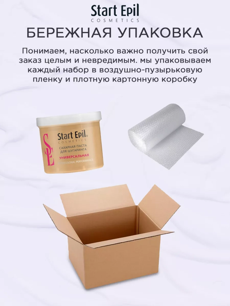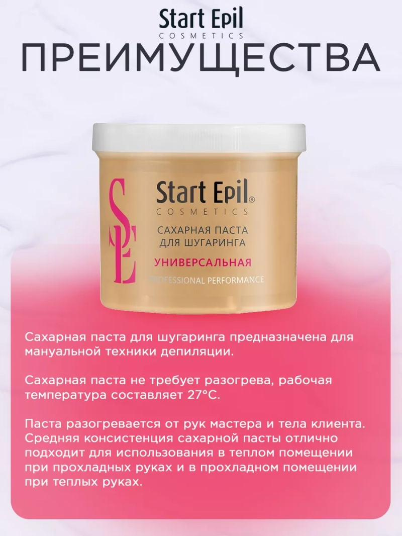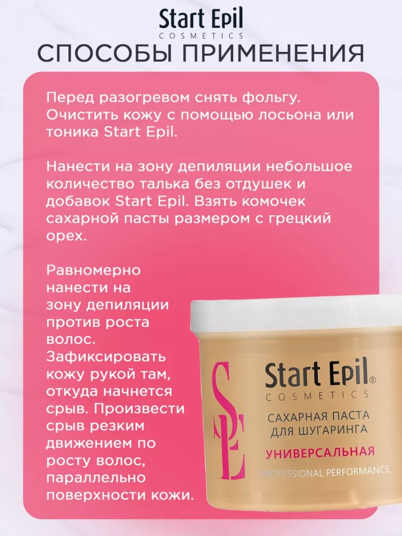ПАСТА ДЛЯ ШУГАРИНГА «УНИВЕРСАЛЬНАЯ», 400 Г. Сахарная паста для шугаринга предназначена для мануальной техники депиляции. Сахарная паста не требует разогрева, рабочая температура составляет 27°С. Паста разогревается от рук мастера и тела клиента. Средняя консистенция сахарной пасты отлично подходит для использования в теплом помещении при прохладных руках и в прохладном помещении при теплых руках. Сахарная паста не травмирует живые клетки кожи, деликатно удаляя волосы длиной 2-5 мм. Волосы становятся более тонкими и ослабленными. При регулярном проведении процедуры депиляции волосы становятся более тонкими, их становится меньше. Процедура со временем становится менее болезненной. Назначение: удаление нежелательных волос. Рекомендации для использования: для профессионального использования. СПОСОБ ПРИМЕНЕНИЯ: Перед разогревом снять фольгу. Очистить кожу с помощью лосьона или тоника Start Epil. Нанести на зону депиляции небольшое количество талька без отдушек и добавок Start Epil. Взять комочек сахарной пасты размером с грецкий орех. Равномерно нанести на зону депиляции против роста волос. Зафиксировать кожу рукой там, откуда начнется срыв. Произвести срыв резким движением по росту волос, параллельно поверхности кожи. Остатки сахарной пасты удалить термальной водой Start Epil и салфеткой. Завершить процедуру средствами для ухода за кожей: молочком увлажняющим или сливками восстанавливающими Start Epil. Меры предосторожности: не наносите на поврежденную кожу и избегайте попадания в глаза. При попадании в глаза тщательно промойте водой. Перед применением тестируйте на небольшом участке кожи.