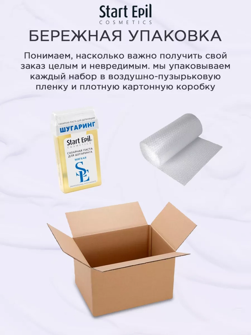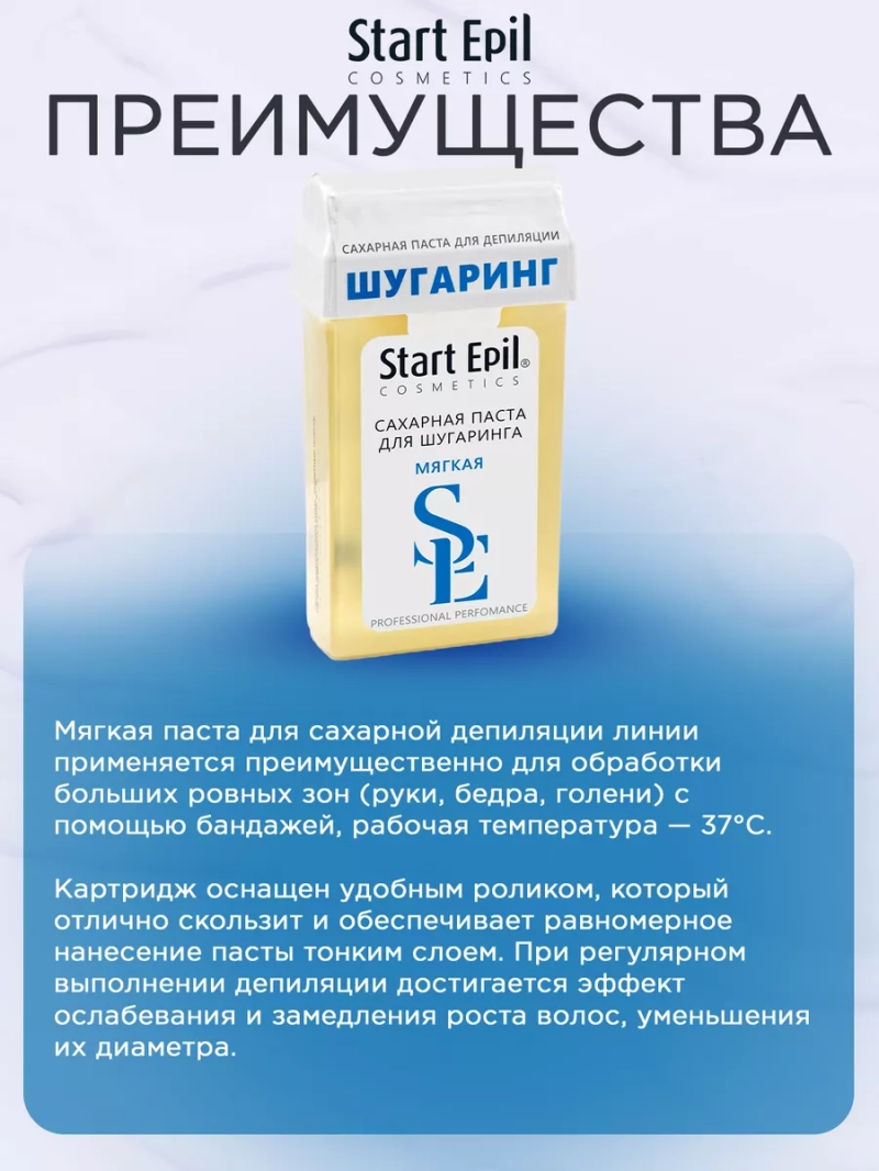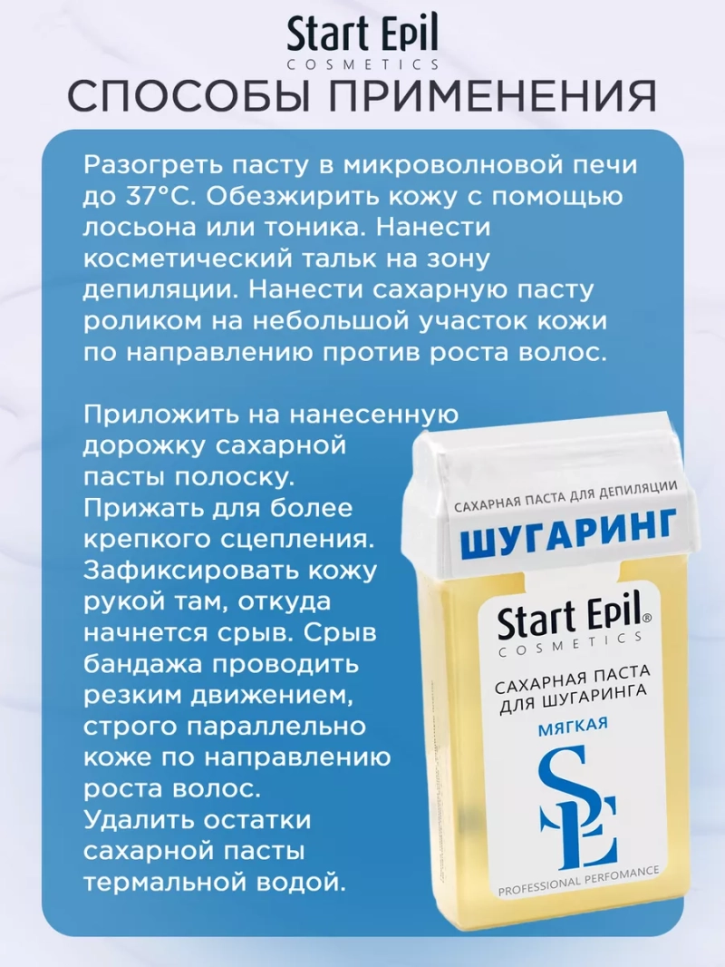ПАСТА ДЛЯ ШУГАРИНГА В КАРТРИДЖЕ «МЯГКАЯ», 100 Г. Мягкая паста для сахарной депиляции линии применяется преимущественно для обработки больших ровных зон (руки, бедра, голени) с помощью бандажей, рабочая температура — 37°С. Картридж оснащен удобным роликом, который отлично скользит и обеспечивает равномерное нанесение пасты тонким слоем. При регулярном выполнении депиляции достигается эффект ослабевания и замедления роста волос, уменьшения их диаметра. Последующие сеансы переносятся комфортнее, а временной интервал между ними увеличивается. Гипоаллергенный продукт. Назначение: удаление нежелательных волос. Рекомендации для использования: для профессионального использования. СПОСОБ ПРИМЕНЕНИЯ: Разогреть пасту в микроволновой печи до 37°С.Обезжирить кожу с помощью лосьона или тоника. Нанести косметический тальк на зону депиляции. Нанести сахарную пасту роликом на небольшой участок кожи по направлению против роста волос. Приложить на нанесенную дорожку сахарной пасты полоску. Прижать для более крепкого сцепления. Зафиксировать кожу рукой там, откуда начнется срыв. Срыв бандажа проводить резким движением, строго параллельно коже по направлению роста волос. Удалить остатки сахарной пасты термальной водой. Завершить процедуру средствами для ухода за кожей. Эффект длится до 4-х недель. Для повышения эффективности проведения процедуры депиляции на всех этапах рекомендуется использовать линейку средства Start Epil. Меры предосторожности: не наносите на поврежденную кожу и избегайте попадания в глаза. При попадании в глаза тщательно промойте водой. Перед применением тестируйте на небольшом участке кожи.