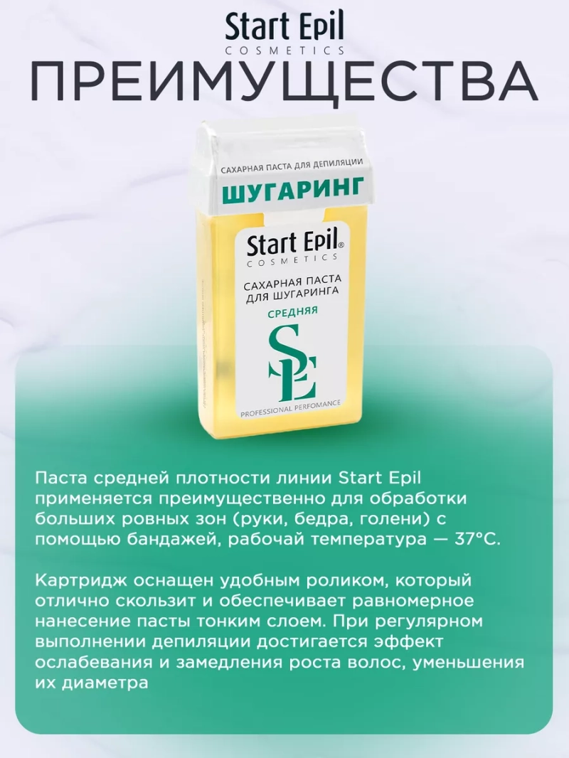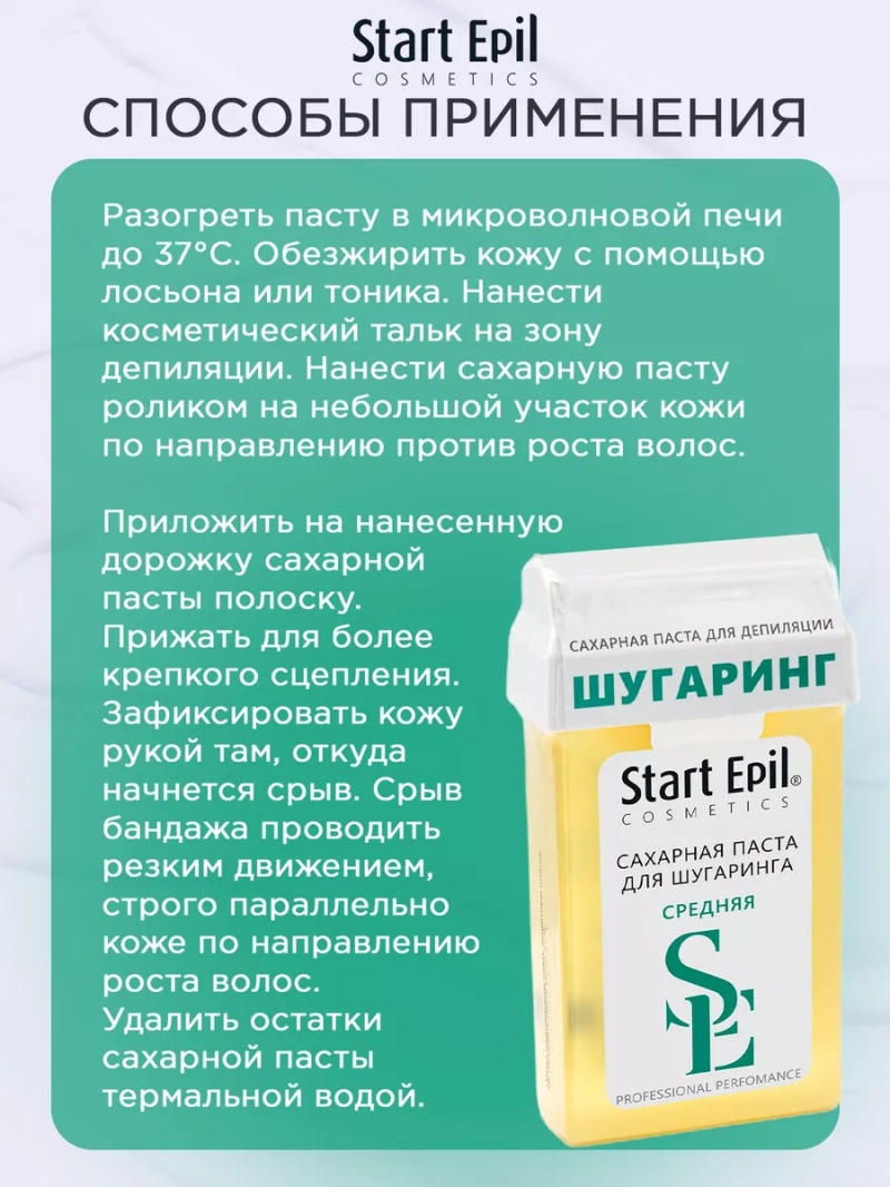 ПАСТА ДЛЯ ШУГАРИНГА В КАРТРИДЖЕ «СРЕДНЯЯ»,100 Г. Паста средней плотности линии Start Epil применяется преимущественно для обработки больших ровных зон (руки, бедра, голени) с помощью бандажей, рабочай температура — 37°С. Картридж оснащен удобным роликом, который отлично скользит и обеспечивает равномерное нанесение пасты тонким слоем. При регулярном выполнении депиляции достигается эффект ослабевания и замедления роста волос, уменьшения их диаметра. Последующие сеансы переносятся комфортнее, а временной интервал между ними увеличивается. Гипоаллергенный продукт. Назначение: удаление нежелательных волос. Рекомендации для использования: для профессионального использования. СПОСОБ ПРИМЕНЕНИЯ: Разогреть пасту в микроволновой печи до 37°С. Обезжирить кожу с помощью лосьона или тоника. Нанести косметический тальк на зону депиляции. Нанести сахарную пасту роликом на небольшой участок кожи по направлению против роста волос. Приложить на нанесенную дорожку сахарной пасты полоску. Прижать для более крепкого сцепления. Зафиксировать кожу рукой там, откуда начнется срыв. Срыв бандажа проводить резким движением, строго параллельно коже по направлению роста волос. Удалить остатки сахарной пасты термальной водой. Завершить процедуру средствами для ухода за кожей. Эффект длится до 4-х недель. Для повышения эффективности проведения процедуры депиляции на всех этапах рекомендуется использовать линейку средства Start Epil.Меры предосторожности: не наносите на поврежденную кожу и избегайте попадания в глаза. При попадании в глаза тщательно промойте водой. Перед применением тестируйте на небольшом участке кожи.