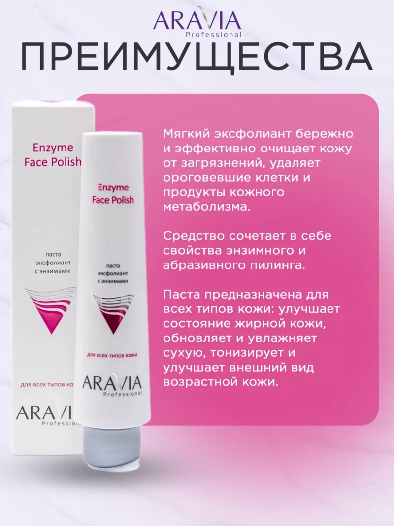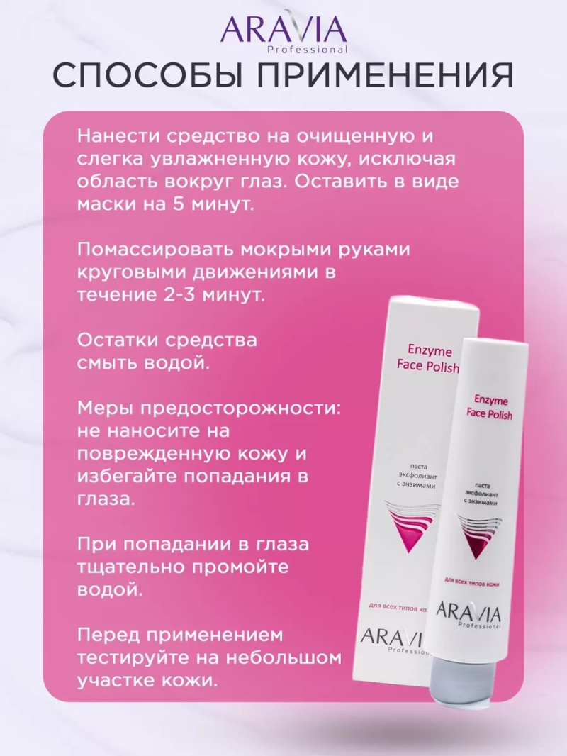 ПАСТА-ЭКСФОЛИАНТ С ЭНЗИМАМИ ДЛЯ ЛИЦА ENZYME FACE POLISH, 100 МЛ. Мягкий эксфолиант бережно и эффективно очищает кожу от загрязнений, удаляет ороговевшие клетки и продукты кожного метаболизма. Средство сочетает в себе свойства энзимного и абразивного пилинга. Паста предназначена для всех типов кожи: улучшает состояние жирной кожи, обновляет и увлажняет сухую, тонизирует и улучшает внешний вид возрастной кожи. Назначение: глубокое очищение кожи, эксфолиация. Рекомендации для использования: 1-2 раза в неделю для глубокого очищения кожи лица. Биоактивный состав: масло календулы, папаин, диоксид кремния, мелкодисперсная розовая глина. Диоксид эко-кремния — обеспечивает мягкое механическое воздействие, выравнивает микрорельеф кожи, глубоко очищает поры. Папаин — благодаря своим кератолитическим свойствам, полирует и разглаживает кожу, стимулирует процессы обновления клеток. Розовая глина — обладает бактерицидным и успокаивающим действием. Состав продукта (INCI): Aqua, Emulsifying wax, Calendula Officinalis Flower Oil, Caprylic/Capric Triglyceride, Glycerin, Stearic Acid, Silica, Kaolin, Papain, Diazolidinyl Urea, Phenoxyethanol (and) Ethylhexylglycerin, Propylene Glycol, Parfum, Tocopheryl Acetate, Sodium EDTA. СПОСОБ ПРИМЕНЕНИЯ: Нанести средство на очищенную и слегка увлажненную кожу, исключая область вокруг глаз. Оставить в виде маски на 5 минут. Помассировать мокрыми руками круговыми движениями в течение 2-3 минут. Остатки средства смыть водой. Меры предосторожности: не наносите на поврежденную кожу и избегайте попадания в глаза. При попадании в глаза тщательно промойте водой. Перед применением тестируйте на небольшом участке кожи.