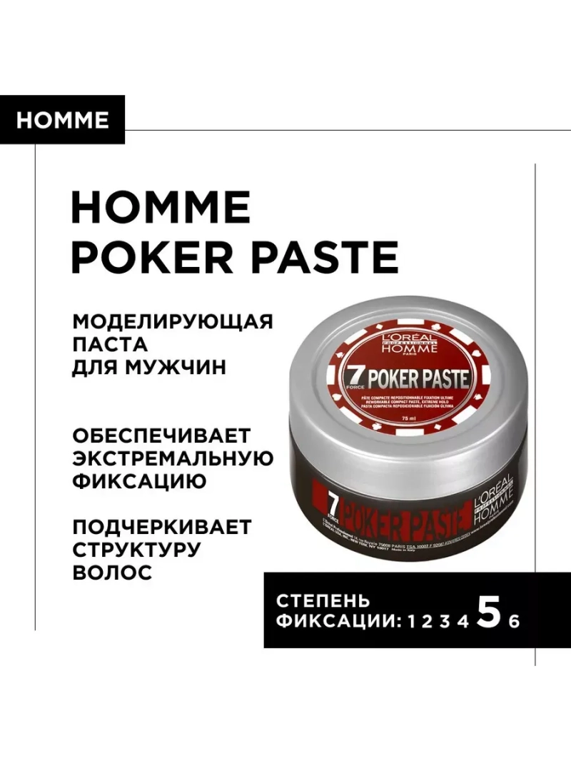 Моделирующая паста экстрасильной фиксации L'Oreal Professionnel Homme Poker Paste. Моделирующая паста L'Oréal Professionnel Homme LP-безграничные возможности для создания неповторимых образов. Моделирующая крем-паста из профессиональной линии Homme — незаменимый помощник для создания укладок любой сложности и надежной фиксации. Специально разработанная формула, обогащенная активными компонентами, воплотит в жизнь ваши самые смелые задумки—от легкой небрежности до четко очерченной структуры. В основе эффективности гель-пасты L'Oréal Professionnel лежит комплекс активных компонентов. Паста Poker Paste обладает экстремально сильной стойкой фиксацией. Входящие в состав активные полимеры мгновенно впитываются и надежно закрепляют любой стайлинг. Паста легко распределяется и остается невидимой на волосах. Идеальный стайлинг для жестких и толстых волос. Для усиления фиксации и защиты от влаги используйте фиксирующий спрей от L'Oréal Professionnel. Паста идеально подходит для нормальных и тонких волос. Она не склеивает волосы, сохраняя их мягкость и подвижность. В отличие от геля для укладки волос, она не склеивает пряди и позволяет сохранять естественное движение волос. Продукт также идеально подходит для тех, кто предпочитает профессиональный уход за волосами, так как он является частью полноценной линии средств для укладки волос. Матовый воск для волос лореаль обеспечит долгую и надежную фиксацию волос, не придавая им блеска. Благодаря экономному расходу данной глины для волос хватит на долгое и качественное использование. Эта паста станет отличным дополнением к набору для кудрявых волос и профессиональному уходу за волосами.Придает волосам здоровый блеск и ухоженный вид. Применение: тщательно разогрейте в ладонях в течение 8-10 секунд. Затем проработайте конкретные пряди или нанесите на все волосы в зависимости от желаемого результата. Эффект: экстремально-сильная фиксация укладки на целый день с матовым эффектом.