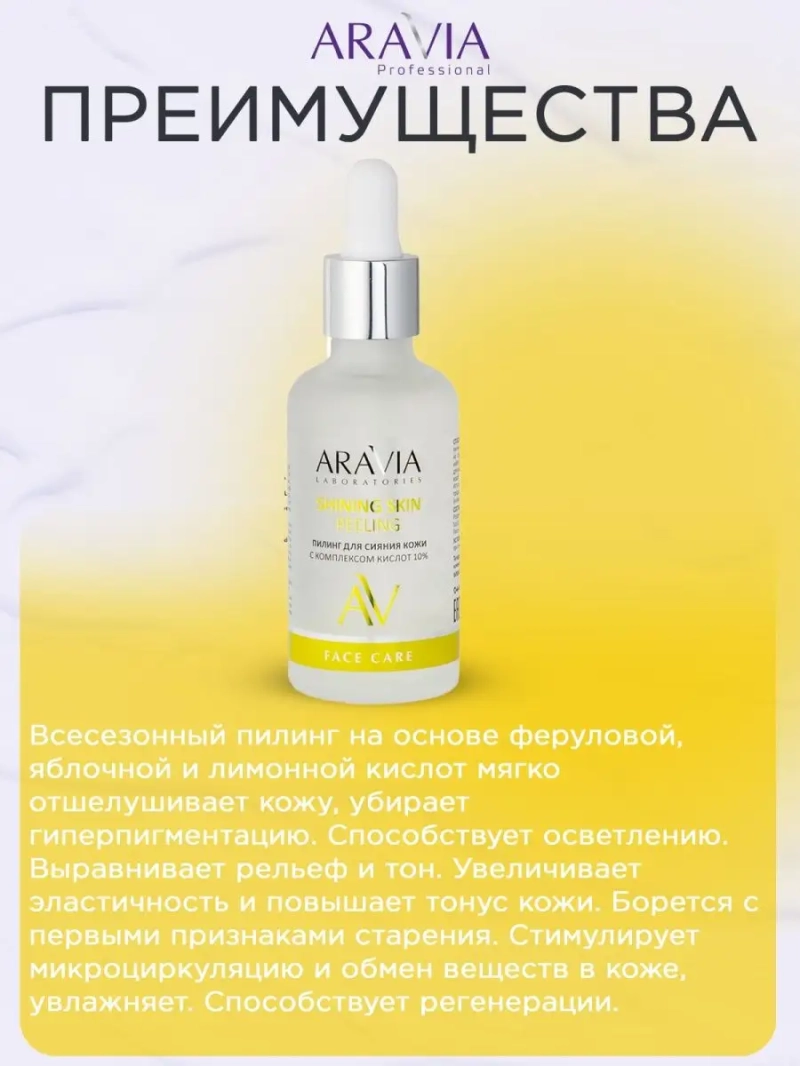 ПИЛИНГ ДЛЯ СИЯНИЯ КОЖИ С КОМПЛЕКСОМ КИСЛОТ 10% SHINING SKIN PEELING, 50 МЛ. Всесезонный пилинг на основе феруловой, яблочной и лимонной кислот мягко отшелушивает кожу, убирает гиперпигментацию. Способствует осветлению. Выравнивает рельеф и тон. Увеличивает эластичность и повышает тонус кожи. Борется с первыми признаками старения. Стимулирует микроциркуляцию и обмен веществ в коже, увлажняет. Способствует регенерации. рН — 3,5-3,7. Назначение: интенсивный уход за кожей, глубокое очищение, пилинг. Рекомендации для использования: рекомендуется использовать 1 раз в 7-10 дней (средняя продолжительность курса — 10 процедур). ДЕЙСТВИЕ: осветляющее, отшелушивающее, увлажняющее, убирает гиперпигментацию, увеличивает эластичность, выравнивает рельеф, борется признаками старения. Биоактивный состав: феруловая кислота, яблочная кислота, лимонная кислота, экстракт пиона. Феруловая кислота — мощный антиоксидант. Оказывает противомикробное и противовоспалительное действие. Отшелушивает и отбеливает. Повышает упругость и эластичность кожи, увлажняет.Отшелушивает, стимулирует микроциркуляцию и обмен веществ. Тонизирует. Восстанавливает кислотно-щелочной баланс кожи, обладает антиоксидантным, противовоспалительным и дезинфицирующим действием. Экстракт пиона — способствует коррекции чрезмерных покраснений и сокращения пигментации и пятен. Оказывает осветляющий эффект. Уменьшает образование свободных радикалов, вызванных загрязнениями окружающей среды и табакокурением.СПОСОБ ПРИМЕНЕНИЯ: Равномерно нанесите пилинг с помощью косметической кисти на предварительно очищенное сухое лицо, избегая область вокруг глаз. Оставьте для воздействия на 5-10 минут. Тщательно смойте водой. Нанесите тоник и увлажняющий крем. Используйте 1 раз в 7-10 дней. Средняя продолжительность курса — 10 процедур (в зависимости от состояния кожи). Меры предосторожности: не наносите на поврежденную кожу и избегайте попадания в глаза. При попадании в глаза тщательно промойте водой.