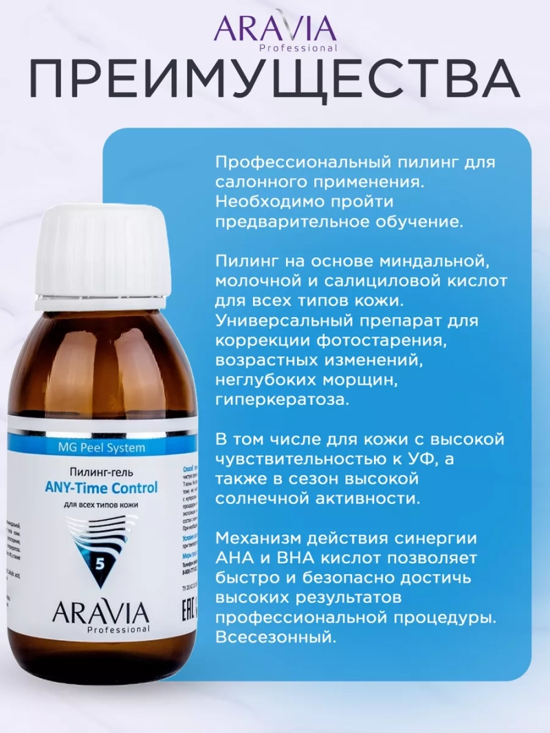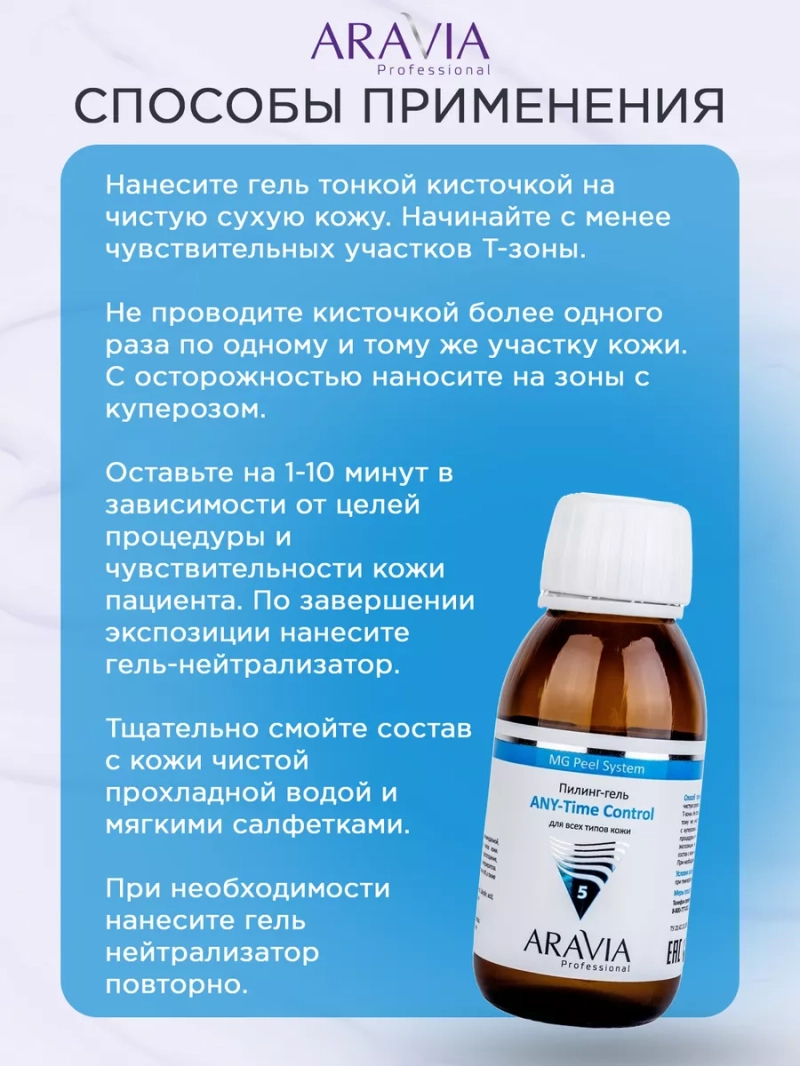 ПИЛИНГ-ГЕЛЬ ANY-TIME CONTROL, ВСЕСЕЗОННЫЙ ДЛЯ ВСЕХ ТИПОВ КОЖИ, 100 МЛ. Важно! Специальный продукт, только для профессионального применения. Всесезонный. Особенности: для всех типов кожи. pH 3.0. Концентрация кислот 5%. Оказывает антисептическое действие, повышает естественные защитные свойства кожи. Состав продукта (INCI): Aqua, Ethoxydiglycol, Salicylic acid, Mandelic acid, Sodium Lactate, Hydroxyethylcellulose. СПОСОБ ПРИМЕННЕНИЯ: Внимание! Ознакомьтесь с инструкцией перед применением.Нанесите гель тонкой кисточкой на чистую сухую кожу. Начинайте с менее чувствительных участков Т-зоны. Не проводите кисточкой более одного раза по одному и тому же участку кожи. С осторожностью наносите на зоны с куперозом. Оставьте на 1-10 минут в зависимости от целей процедуры и чувствительности кожи пациента. По завершении экспозиции нанесите гель-нейтрализатор. Тщательно смойте состав с кожи чистой прохладной водой и мягкими салфетками. Не наслаивайте пилинг и не используйте под целлофановую плёнку. Избегайте попадания в глаза. При попадании в глаза сразу же промойте их большим количеством прохладной проточной воды и слабым раствором соды.Особенности химических пилингов с кислотами: во время экспозиции пилинга допустима небольшая локальная эритема (покраснение) и лёгкое пощипывание, покалывание кожи. При сильной эритеме, жжении или побелении участков кожи, похожим на иней быстро нанесите нейтрализатор локально на проблемные участки.Если вы делаете пилинг дома самостоятельно, нанесите пилинг локально, затем на всё лицо, выдержите время, указанное в инструкции и тщательно смойте пилинг и нейтрализатор большим количеством прохладной проточной воды. После процедуры возможно небольшое локальное шелушение и лёгкая эритема в течении нескольких часов. Если эритема усиливается или сохраняется дольше 6 часов, появился зуд, жжение, усилился дискомфорт, обязательно проконсультируйтесь с косметологом. Для купирования шелушения используйте назначенный вашим косметологом домашний уход.