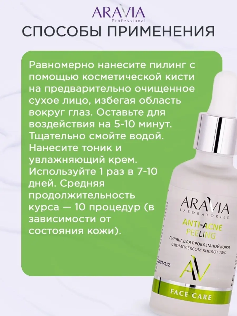 ПИЛИНГ ДЛЯ ПРОБЛЕМНОЙ КОЖИ С КОМПЛЕКСОМ КИСЛОТ 18% ANTI-ACNE PEELING, 50 МЛ. Всесезонный пилинг устраняет воспалительные элементы. Борется с комедонами и черными точками. Отшелушивает ороговевшие клетки, осветляет кожу, убирает пигментацию и постакне. Уменьшает поры и регулирует выработку себума. Обладает мощным антибактериальным действием. Увлажняет, улучшает барьерные свойства кожи, разглаживает морщины, повышает упругость и улучшает качество кожи. Обладает антиоксидантными свойствами. Выравнивает тон и рельеф кожи. Рекомендуется для жирной и проблемной кожи. pH 3.5. Назначение: интенсивный уход за кожей, глубокое очищение, пилинг. Рекомендации для использования: 1 раз в 7-10 дней (средняя продолжительность курса — 10 процедур). ДЕЙСТВИЕ: увлажняющее, противовоспалительное, убирает следы постакне, борется с черными точками, повышает упругость, выравнивает тон, улучшает качество кожи. Биоактивный состав: азелаиновая кислота, салициловая кислота, глюконовая pha кислота, миндальная кислота, биофлавоноиды, экстракт алоэ, экстракт брокколи, лактат натрия. Азелаиновая кислота обладает мощным антибактериальным действием. Отшелушивает, предотвращает закупорку пор и образование комедонов. Экстракт брокколи оказывает отбеливающее, антиоксидантное, противовоспалительное, вяжущее и тонизирующее действие. Лактат натрия обладает легким осветляющим действием. СПОСОБ ПРИМЕНЕНИЯ: Равномерно нанесите пилинг с помощью косметической кисти на предварительно очищенное сухое лицо, избегая область вокруг глаз. Оставьте для воздействия на 5-10 минут. Тщательно смойте водой. Нанесите тоник и увлажняющий крем. Используйте 1 раз в 7-10 дней. Средняя продолжительность курса — 10 процедур (в зависимости от состояния кожи). Меры предосторожности: не наносите на поврежденную кожу и избегайте попадания в глаза. При попадании в глаза тщательно промойте водой. Перед применением тестируйте на небольшом участке кожи.