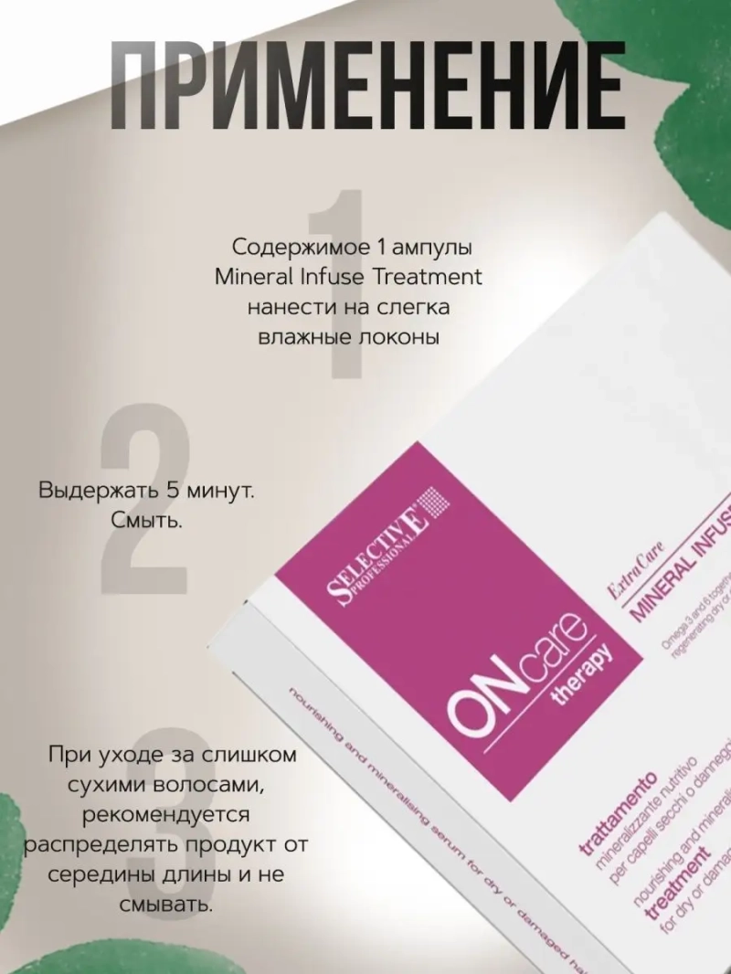 Selective Professional On Care Mineral Infuse Питательная сыворотка для сухих и поврежденных волос, 10 мл, 10 шт., ампулы. Благодаря синергичному балансирующему и восстанавливающему действию минеральных олигоэлементов и растительных масел с богатым содержанием витаминов, омега-3 и 6 сыворотка мгновенно питает и обогащает минералами, восстанавливает сухие или повреждённые волосы, придавая им объём, мягкость и блеск. Способ применения: содержимое 1 ампулы Mineral Infuse Treatment нанести на слегка влажные локоны, выдержать 5 минут. Смыть. При уходе за слишком сухими волосами, рекомендуется распределять продукт от середины длины и не смывать.