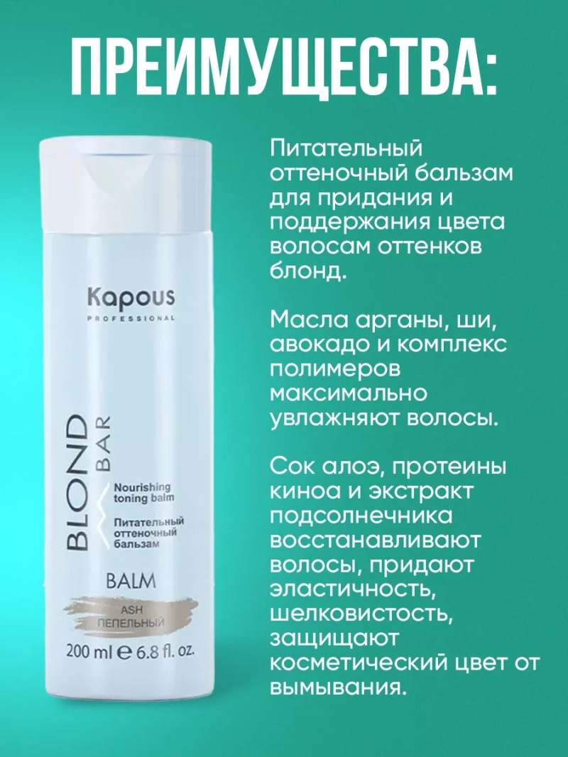 Оттеночный бальзам серии "Blond Bar" для придания и поддержания цвета волосам оттенков блонд. Содержащиеся масла Арганы, Ши и Авокадо максимально увлажняют осветленные (обесцвеченные) волосы. Сок Алоэ и гидролизованные протеины Киноа обладают восстанавливающим и реконструирующим действием. Экстракт семян Подсолнечника защищает косметический цвет от "вымывания", комплекс полимеров придает эластичность, шелковистость и бриллиантовый блеск волосам. Комплекс пигментов придает пепельные оттенки осветленным (обесцвеченным) волосам. Не использовать на "желтых" волосах, либо использовать правило нейтрализации. Бальзам не содержит аммиака и перекиси водорода, поэтому его можно использовать так часто, как это необходимо для поддержания оттенка. Способ применения: перед использованием надеть перчатки, бальзам нанести на чистые волосы, расчесать для равномерного результата. Время выдержки 5-15 минут. По истечении времени смыть обильным количеством воды без использования шампуня. При использовании бальзама учитывайте фон осветления, правила нейтрализации и смешения цветов.