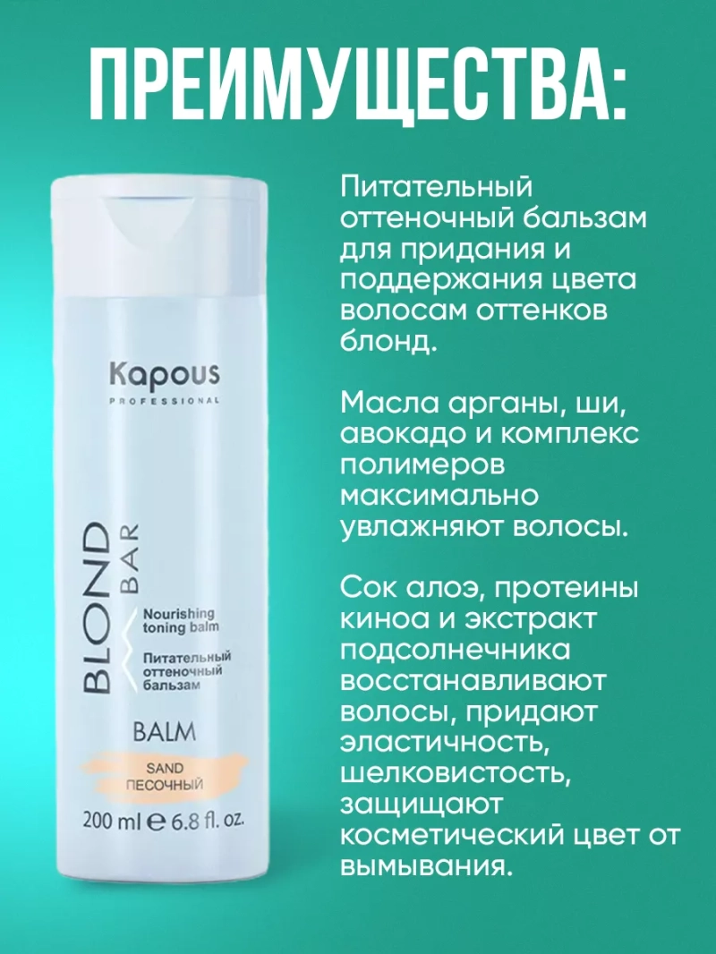 Оттеночный бальзам серии "Blond Bar" для придания и поддержания цвета волосам оттенков блонд. Содержащиеся масла Арганы, Ши и Авокадо максимально увлажняют осветленные (обесцвеченные) волосы. Сок Алоэ и гидролизованные протеины Киноа обладают восстанавливающим и реконструирующим действием. Экстракт семян Подсолнечника защищает косметический цвет от "вымывания", комплекс полимеров придает эластичность, шелковистость и бриллиантовый блеск волосам. Комплекс пигментов придает бежевые, песочные оттенки осветленным (обесцвеченным) волосам. Бальзам не содержит аммиака и перекиси водорода, поэтому его можно использовать так часто, как это необходимо для поддержания оттенка. Способ применения: перед использованием надеть перчатки, бальзам нанести на чистые волосы, расчесать для равномерного результата. Время выдержки 5-15 минут. По истечении времени смыть обильным количеством воды без использования шампуня. При использовании бальзама учитывайте фон осветления, правила нейтрализации и смешения цветов.
