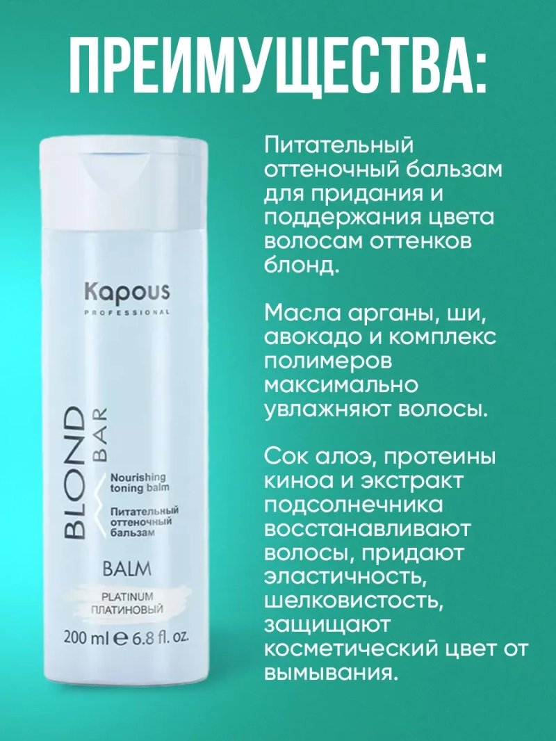 Оттеночный бальзам серии "Blond Bar" для придания и поддержания цвета волосам оттенков блонд. Содержащиеся масла Арганы, Ши и Авокадо максимально увлажняют осветленные (обесцвеченные) волосы. Сок Алоэ и гидролизованные протеины Киноа обладают восстанавливающим и реконструирующим действием. Экстракт семян Подсолнечника защищает косметический цвет от "вымывания", комплекс полимеров придает эластичность, шелковистость и бриллиантовый блеск волосам. Сине-фиолетовые пигменты идеально нейтрализуют "желтый" фон осветления и придают бежевые, платиновые оттенки осветленным (обесцвеченным) волосам. Бальзам не содержит аммиака и перекиси водорода, поэтому его можно использовать так часто, как это необходимо для поддержания оттенка. Способ применения: перед использованием надеть перчатки, бальзам нанести на чистые волосы, расчесать для равномерного результата. Время выдержки 5-15 минут. По истечении времени смыть обильным количеством воды без использования шампуня. При использовании бальзама учитывайте фон осветления, правила нейтрализации и смешения цветов.