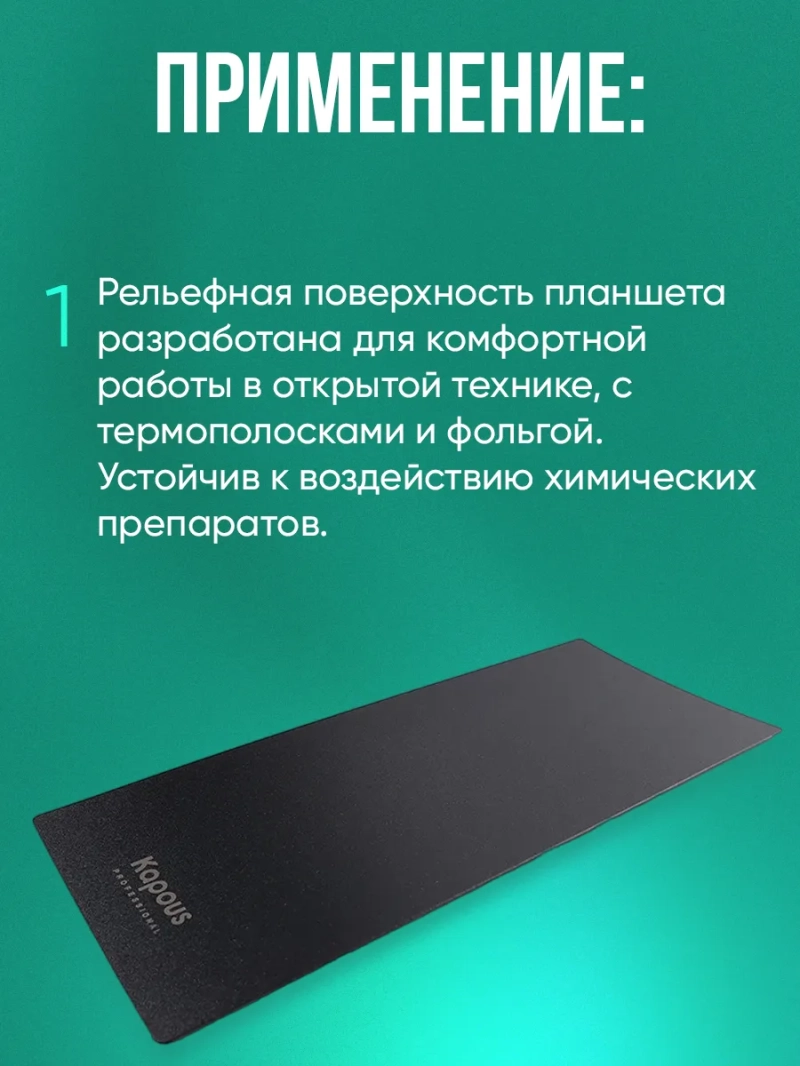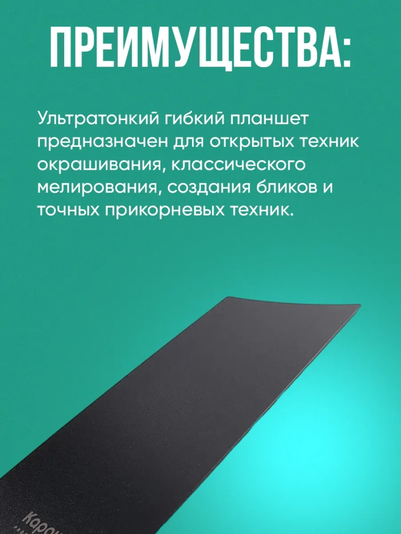 Ультратонкий гибкий планшет предназначен для открытых техник окрашивания, классического мелирования, создания бликов и точных прикорневых техник. Рельефная поверхность планшета разработана для комфортной работы в открытой технике, с термополосками и фольгой. Устойчив к воздействию химических препаратов.