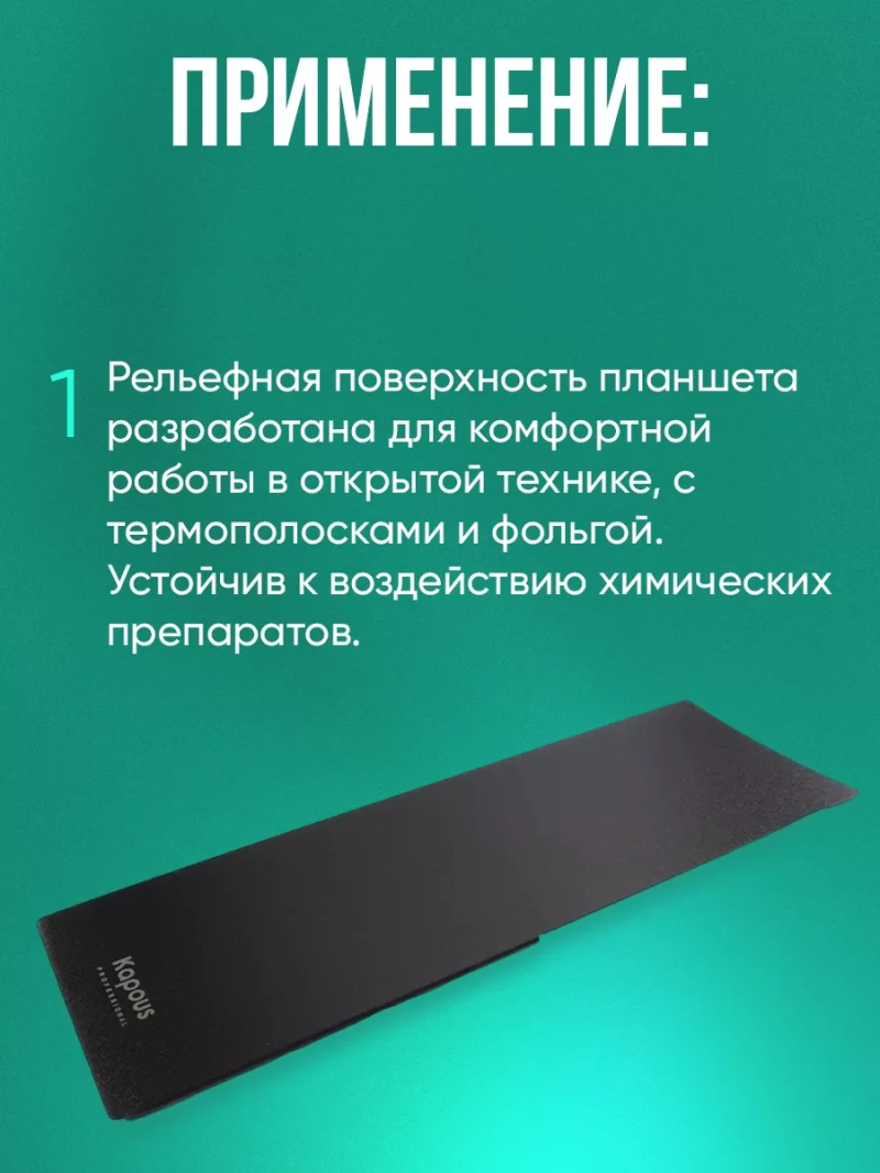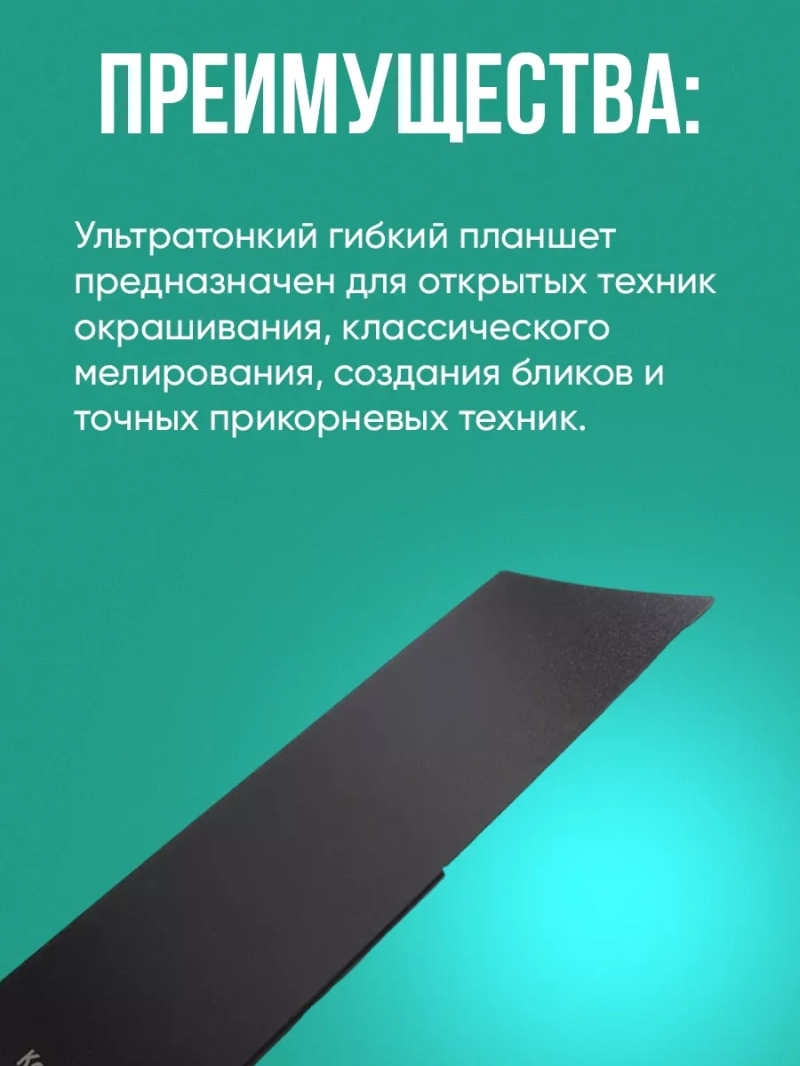 Ультратонкий гибкий планшет предназначен для открытых техник окрашивания, классического мелирования, создания бликов и точных прикорневых техник. Рельефная поверхность планшета разработана для комфортной работы в открытой технике, с термополосками и фольгой. Устойчив к воздействию химических препаратов.