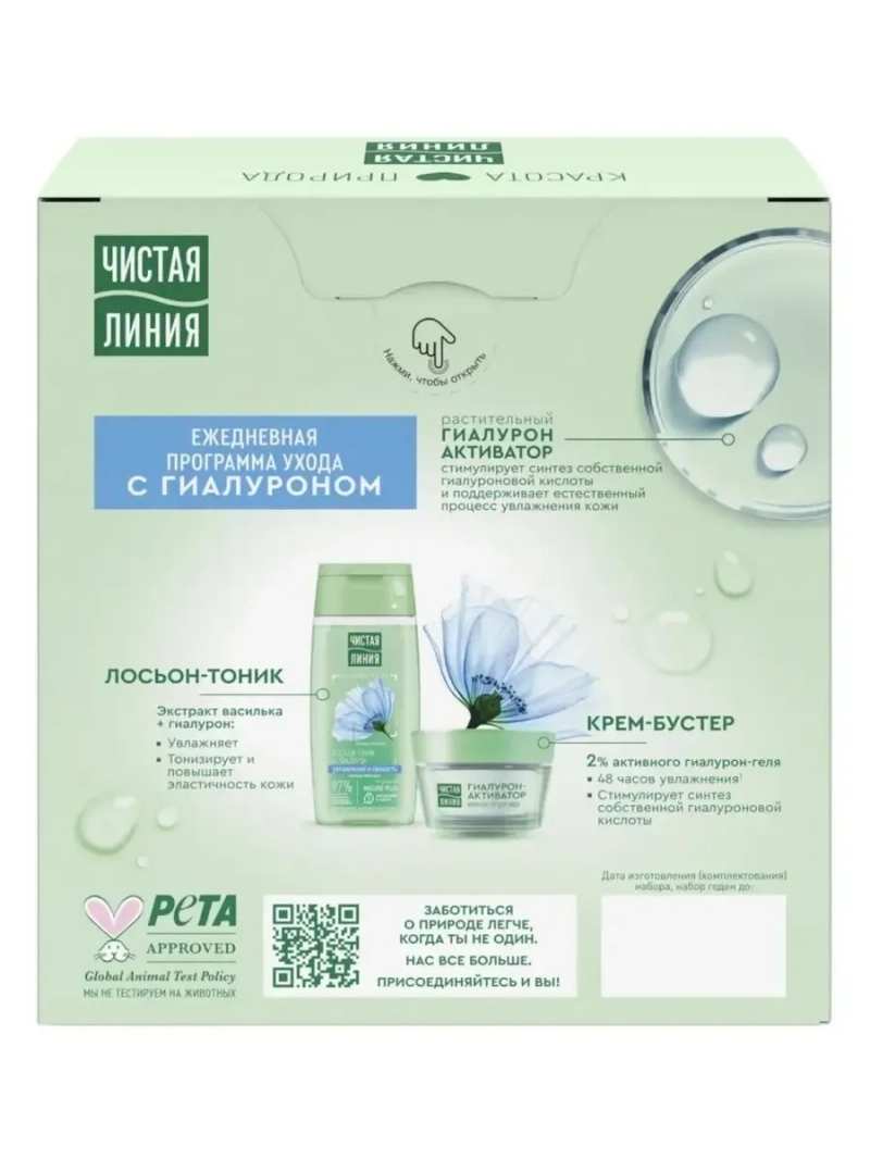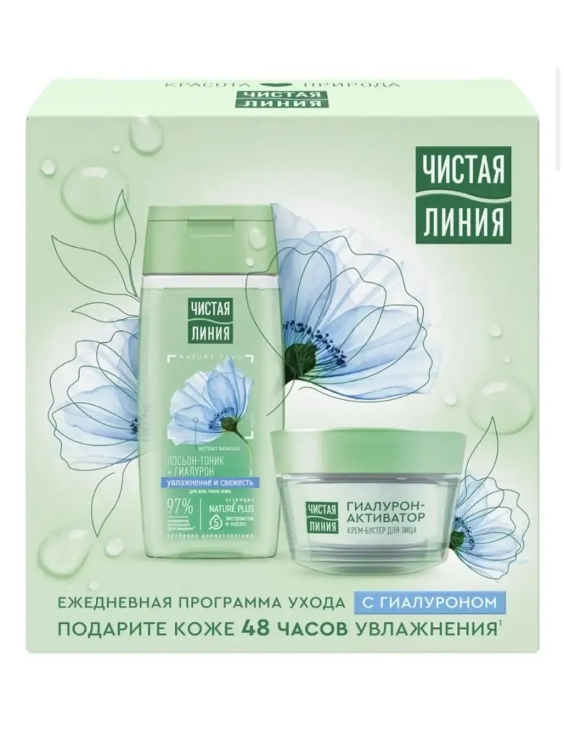 Для комплексного ухода за кожей лица подарите ежедневную программу ухода с растительным гиалурон-активатором от бренда Чистая Линия. Гиалурон-активатор стимулирует синтез собственной гиалуроновой кислоты и поддерживает естественный процесс увлажнения кожи. Лосьон-тоник с экстрактом василька и гиалуроном: • Увлажняет. • Тонизирует и повышает эластичность кожи. Крем-бустер: • Увлажняет. • Питает и смягчает, обеспечивает 48 часов увлажнения.