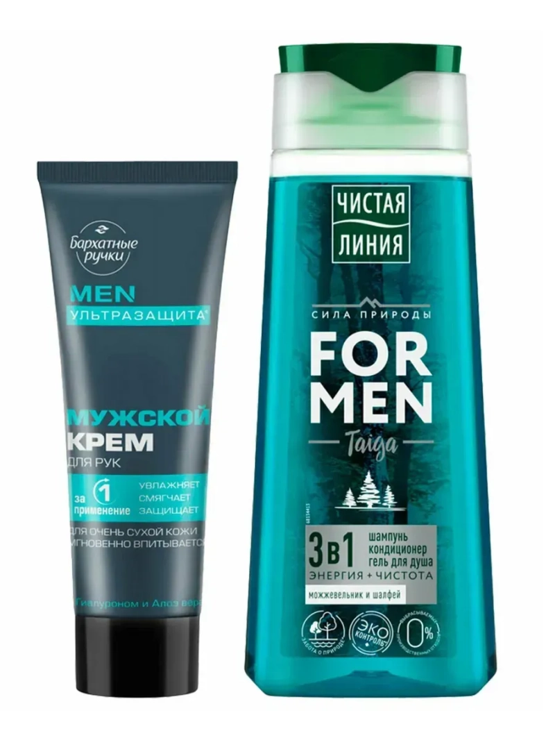 Это идеальный выбор для заботы о коже рук и бережного очищения волос и кожи. В набор входит шампунь для волос 3в1 «Чистая Линия Энергия+Чистота» и мужской крем для рук «Бархатные Ручки». Шампунь мужской «Энергия+Чистота» подходит для комплексного ухода за волосами и телом. Он сочетает в себе шампунь, кондиционер и гель для душа. Формула средства на 80% состоит из отвара трав и обогащена маслом шалфея и экстрактом можжевельника. Крем для рук мужской «Бархатные ручки» с гиалуроном и алоэ вера увлажняет, успокаивает и смягчает кожу, устраняет шелушение и восстанавливает даже очень сухую кожу. Средство обладает лёгкой текстурой, мгновенно впитывается и не оставляет жирной плёнки.