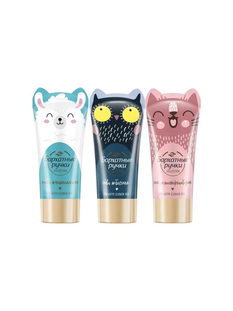 БАРХАТНЫЕ РУЧКИ Подарочный набор FUNNY ANIMALS (крем для рук 3*45мл). Это отличный выбор для ухода за кожей рук. В подарочный набор входят три увлажняющих крема по 45 мл из коллекции «Основной уход». Упаковка выполнена в виде милых енотов. Кремы для рук от «Бархатных Ручек» не только увлажняют кожу, но и дарят хорошее настроение. Питательный крем содержит экстракт алоэ вера и масло кокоса. Они увлажняют и тонизируют кожу, делая её более упругой. Лёгкий восстанавливающий крем надолго увлажняет кожу и не оставляет липкой плёнки. Крем с фруктовым ароматом делает уход за кожей ещё приятнее. Компактный крем легко взять с собой. Он подходит для взрослых и детей с 4 лет. Набор кремов станет отличным подарком на любой праздник. Порадуйте своих близких!