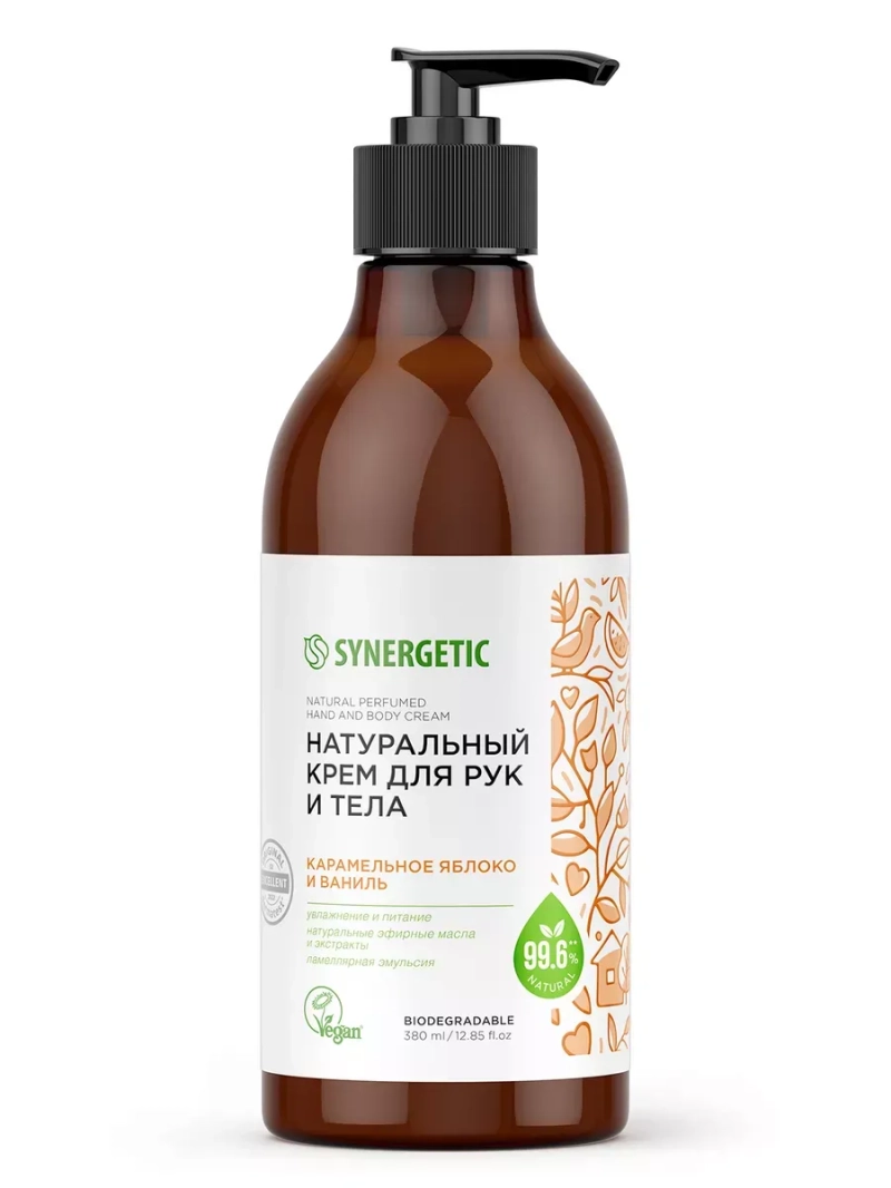 Крем - Натуральный крем для рук и тела SYNERGETIC "Карамельное яблоко и ваниль" обеспечивает эффективное увлажнение и дарит коже ощущение комфорта. Активные компоненты крема в сочетании с изомератом сахарида восстанавливают естественный водный баланс и улучшают внешний вид кожи, препятствуя потере влаги. Комплекс натуральных масел ши, кокоса, сладкого миндаля и экстракт яблока оказывают регенерирующее действие, интенсивно питают и смягчают кожу, делая ее гладкой. Бисаболол и масло авокадо восстанавливают барьерные функции кожи и успокаивают, а экстракт ванили защищает от негативного воздействия внешней среды. Натуральный пребиотик трегалоза нормализует и сохраняет естественный микробиом кожи. Парфюмерная композиция с натуральными эфирными маслами померанца, корицы и лимона оставляет на коже волнующий аромат.