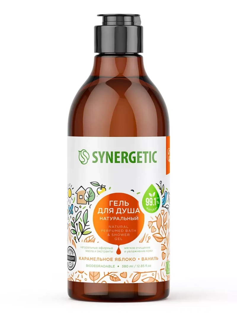 Гель - Натуральный биоразлагаемый гель для душа SYNERGETIC "Карамельное яблоко и ваниль" - это деликатное средство для очищения кожи, более чем на 99% состоящее из натуральных компонентов. Растительные компоненты, натуральные масла, экстракты и уникальный аромат - вот рецепт парфюмированного геля для душа SYNERGETIC. Гипоаллергенная парфюмерная композиция разработана в швейцарском доме Givaudan, где уже более ста лет создают ароматы, которые используются во всем мире в парфюмерии и косметике. Аромат геля для душа разработан с использованием натуральных эфирных масел померанца, корицы и лимона. Масла бабассу и сладкого миндаля, экстракты ванили и яблока оказывают регенерирующее действие, питают и увлажняют сухую кожу, делая её гладкой и бархатистой. Бисаболол снимает раздражение и восстанавливает барьерные функции кожи. Никотиновая кислота (Витамин В3) стимулирует синтез коллагена, увлажняет, смягчает и повышает эластичность кожи. Мультифункциональный компонент натурального происхождения софоролипид мягко очищает и сохраняет естественный микробиом кожи.