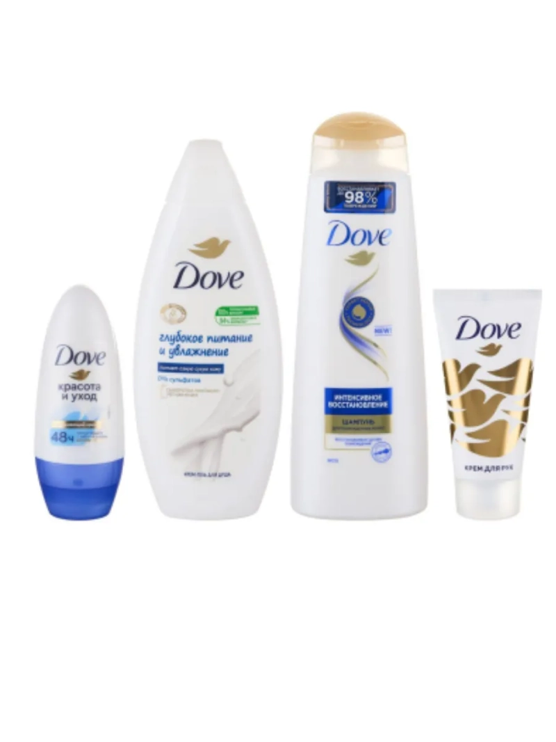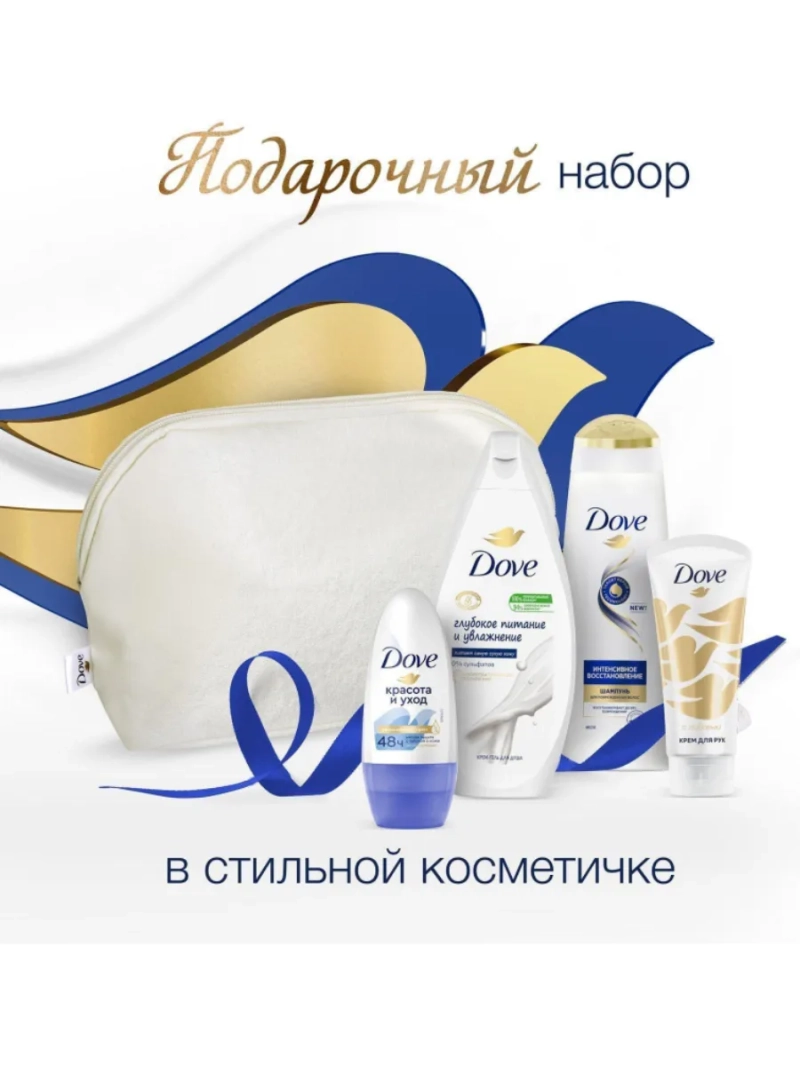 Подарите себе незабываемые моменты нежности и сделайте свой день по-настоящему счастливым вместе с продукцией Dove. Подарочный набор "Нежнее к твоей коже" в красивой косметичке кожаной женской станет отличным подарком маме, женщине, девушке и подруге. Порадуйте близких подарком на 8 марта, 14 февраля, день рождения, Новый год или купите подарочный набор себе, чтобы наслаждаться ухоженными волосами и мягкой, нежной, красивой кожей. Восстанавливающий шампунь бережно очищает волосы, делая их мягкими и ухоженными, облегчая расчесывание. В основе формулы женского шампуня для ослабленных волос лежит технология Target Repair, которая мгновенно определяет и восстанавливает до 98% повреждений, проникая вглубь волоса. Интенсивное восстановление делает поврежденные волосы более сильными и защищает от ломкости. Шампунь для женщин по уходу за сухими волосами и кожей подходит для нормальных, сухих, поврежденных, жирных, ломких, густых, тонких, кудрявых, окрашенных, непослушных, ослабленных - всех типов волос. Гель для душа Глубокое питание и увлажнение проникает в верхние слои кожи и оказывает питающее действие, делая кожу гладкой и нежной. Деликатная формула увлажняющего крем геля для душа позволяет сохранить микробиом кожи и помогает поддерживать оптимальный водный баланс кожи. Восстанавливающий крем для рук бережно увлажняет руки, делая их мягкими и ухоженными. Увлажняющий крем обеспечивает необходимую влагу, предотвращая сухость и шелушение. Питательный крем для тела обладает легкой текстурой, которая быстро впитывается и не оставляет жирного блеска. Dove дезодорант женский шариковый Оригинальный помогает восстановить раздраженную после бритья кожу, делая её мягкой, нежной и гладкой. Dove женский дезодорант антиперспирант стик обладает тонким и нежным ароматом детской присыпки и подходит для женщин с любым типом кожи и для подростков от 14 лет. Антиперспирант женский прост в применении: нанесите его тонким слоем на чистую и сухую кожу подмышек. Дождитесь полного впитывания.