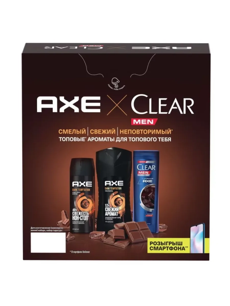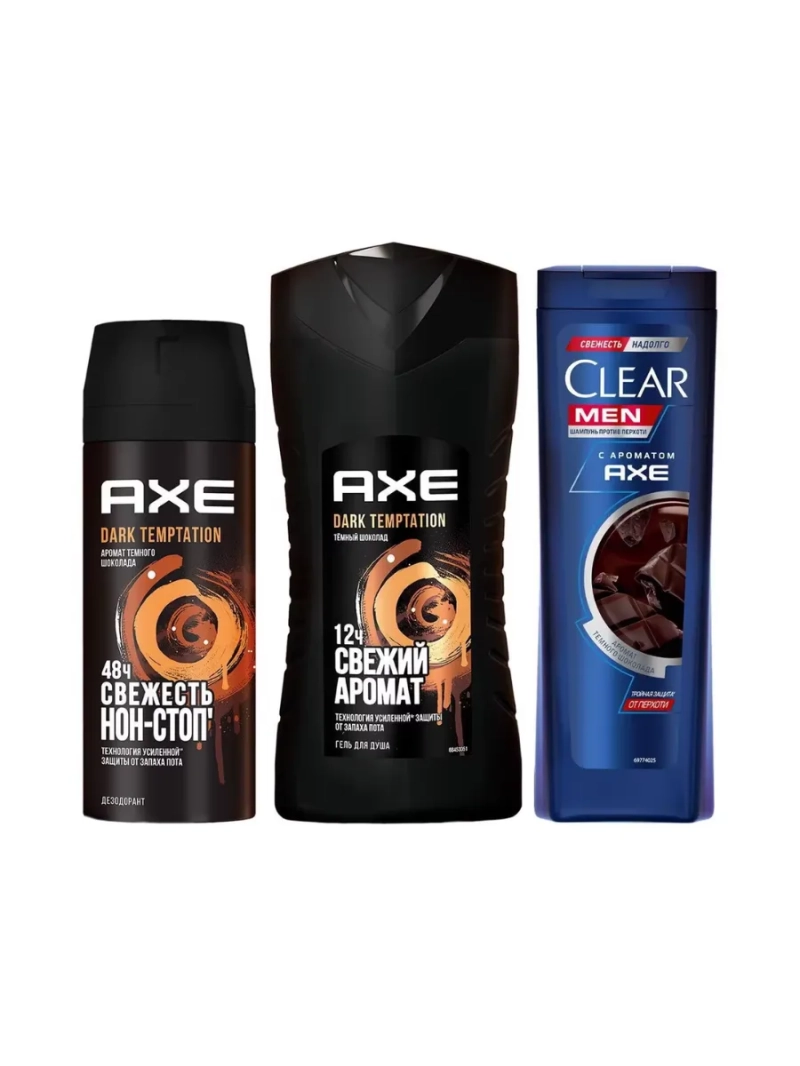 Мужской гель для душа AXE Dark Temptation 250 мл - 1 шт.;Дезодорант спрей Axe Dark Temptation 150 мл - 1 шт.;Шампунь мужской Clear Против перхоти 200 мл - 1 шт. |