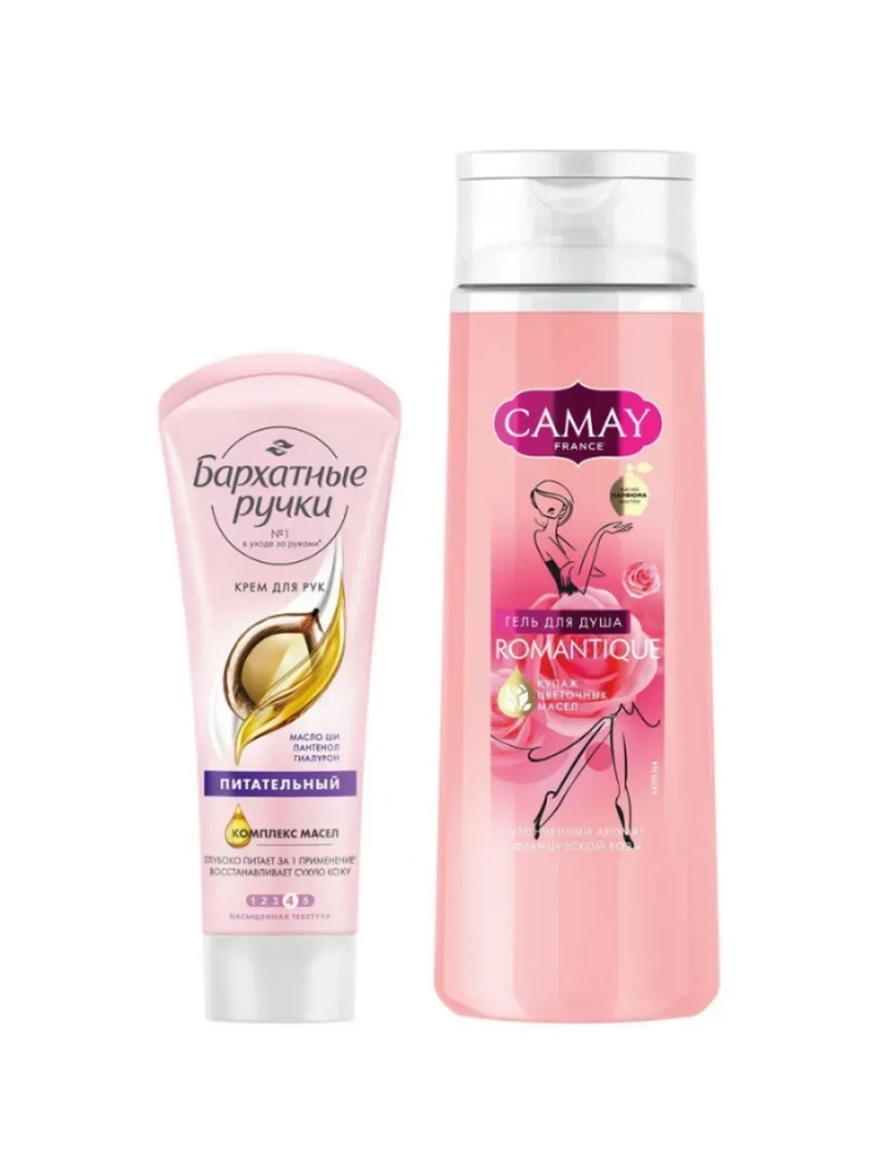 Полное наименование: CAMAY Подарочный набор КРАСОТА И УХОД (гель для душа 250 мл + крем для рук 80 мл). Производитель: Unilever Россия. Подарите себе удовольствие позаботиться о близких вместе с Camay! Небольшой презент, выбранный с любовью, подарит моменты радости и дарителю, и получателю! Подарочный набор Camay Красота и уход – то, что нужно для ежедневной бьюти-рутины. В его составе парфюмированный гель для душа Романтик с роскошным ароматом розы от Camay и питательный крем для рук Бархатные ручки с нотками жасмина и сандалового дерева.