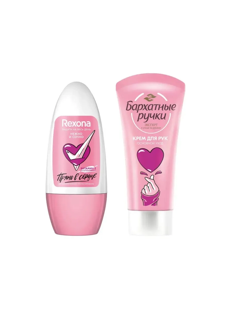 Полное наименование: REXONA Подарочный набор ПРЯМО В СЕРДЦЕ. Производитель: Unilever Россия. Дарите уверенность и заботу с набором Прямо в сердце! Шариковый антиперспирант Rexona обеспечивает надежную защиту от пота и неприятного запаха до 48 часов*. Он легко наносится, быстро впитывается без ощущения липкости, оставляя аромат сочных фруктов. Крем для рук Бархатные ручки с экстрактом алоэ вера нежно ухаживает за кожей рук, делая их нежными и ухоженными. Для использования с 14 лет. * клинически протестировано Unilever.