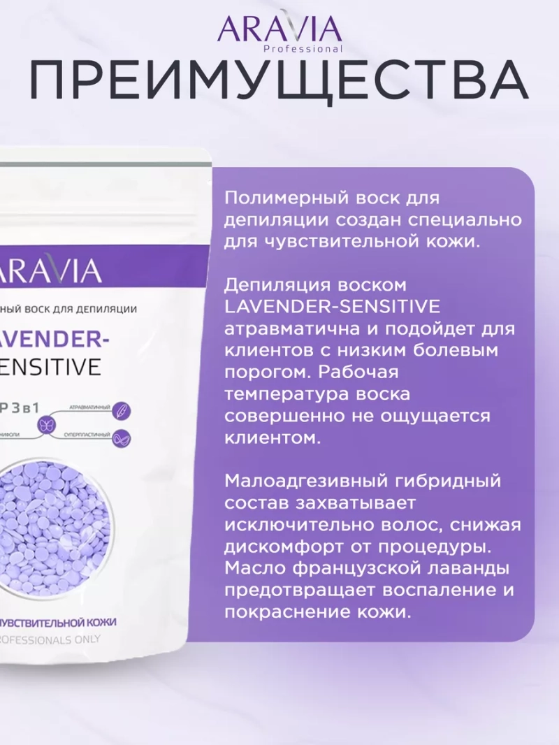 Полимерный воск для депиляции Lavender-sensitive, 1000 г (Aravia Professional, Spa Депиляция). Профессиональный полимерный воск для депиляции разработан специально для чувствительной кожи. Уникальная формула воска позволяет деликатно и эффективно удалить нежелательные волосы на теле. Благодаря особой пластичности, воск легко наносится и способен удалить даже короткие волосы. Французское лавандовое масло, входящее в состав воска, обеспечивает успокаивающее и расслабляющее действие, препятствуя появлению раздражения и покраснений на коже. Депиляция воском не требует использования специальных полосок, воск снимается тонкой плёнкой, обеспечивая удобство и экономичность процедуры. Не содержит канифоль. Состав: Polycyclopentadiene, Cera Microcristallina, Cera Alba (White Beeswax), Paraffin, Ricinus Communis Seed Oil, Lavandula Angustifolia Oil, CI 77891, CI 60725, Linalool. Рекомендации по применению: Разогреть воск в нагревателе до температуры +38-42 С. Обезжирить и очистить кожу от загрязнений с помощью специального средства. Обработать сухую кожу небольшим количеством талька для депиляции. С помощью шпателя нанести небольшое количество воска тонким слоем на обрабатываемый участок без учета направления роста волос, по направлению к себе. Подождать 7-10 секунд, пока воск застынет. Предварительно натянув кожу в направлении, противоположном отрыву, резким движением удалите воск в направлении от себя параллельно коже. Повторить процедуру на остальных участках. По окончании процедуры обработать кожу специальным лосьоном или маслом после депиляции. Нанесите защитные сливки.