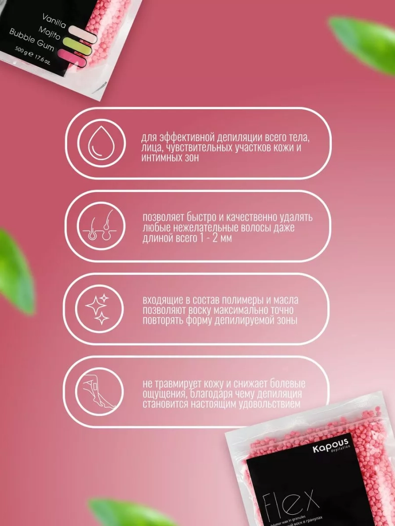 Полимерный воск Flex на основе Kapous — это уникальное средство для депиляции, обладающее инновационной формулой, обеспечивающей высокую эффективность и комфорт. Воск в гранулах, ароматизированный Бабл Гам, подходит для удаления нежелательных волос с любых участков тела, включая лицо и интимные зоны. Благодаря своей низкой рабочей температуре, полимерный воск Flex позволяет быстро и безболезненно удалять даже самые короткие волосы длиной всего 1-2 мм. Уникальная структура воска, созданная на основе полимеров и масел, обеспечивает точное повторение контуров кожи, что значительно увеличивает качество процедуры. Воск Flex не только удаляет волосы, но и действует как пилинг, удаляя ороговевшие клетки и придавая коже мягкость и ухоженный вид. С его помощью вы сможете долго наслаждаться гладкой и здоровой кожей. Легкая текстура полимерного воска Flex позволяет ему легко наноситься на кожу вне зависимости от направления роста волос. Это делает его идеальным как для домашнего использования, так и для профессиональных салонов красоты, поскольку он не требует применения бандажных полосок. Чтобы добиться наилучшего результата, важно соблюдать некоторые меры предосторожности: перед использованием рекомендуется проконсультироваться со специалистом и избегать нанесения воска на поврежденные участки кожи. Состав полимерного воска включает тщательно подобранные компоненты, такие как Indene copolymer, Hydrogenated Microcrystalline Wax и Titanium Dioxide, что обеспечивает максимальную эффективность и безопасность. Для применения полимерного воска Flex достаточно разогреть гранулы в специальном воскоплаве Kapous до нужной консистенции, очистить кожу с помощью очищающего средства и нанести немного талька на обрабатываемую область. Нанесите разогретый воск шпателем, подождите 15-20 секунд, и затем резким движением удалите его. Полимерный воск Flex на основе Kapous — это идеальное решение для тех, кто ценит комфорт и эффективность.