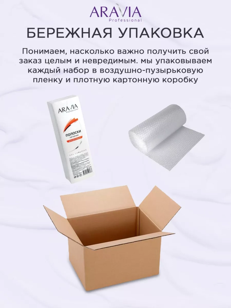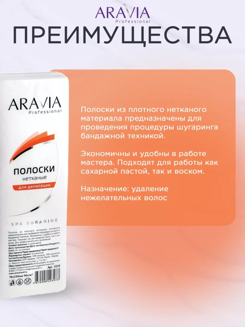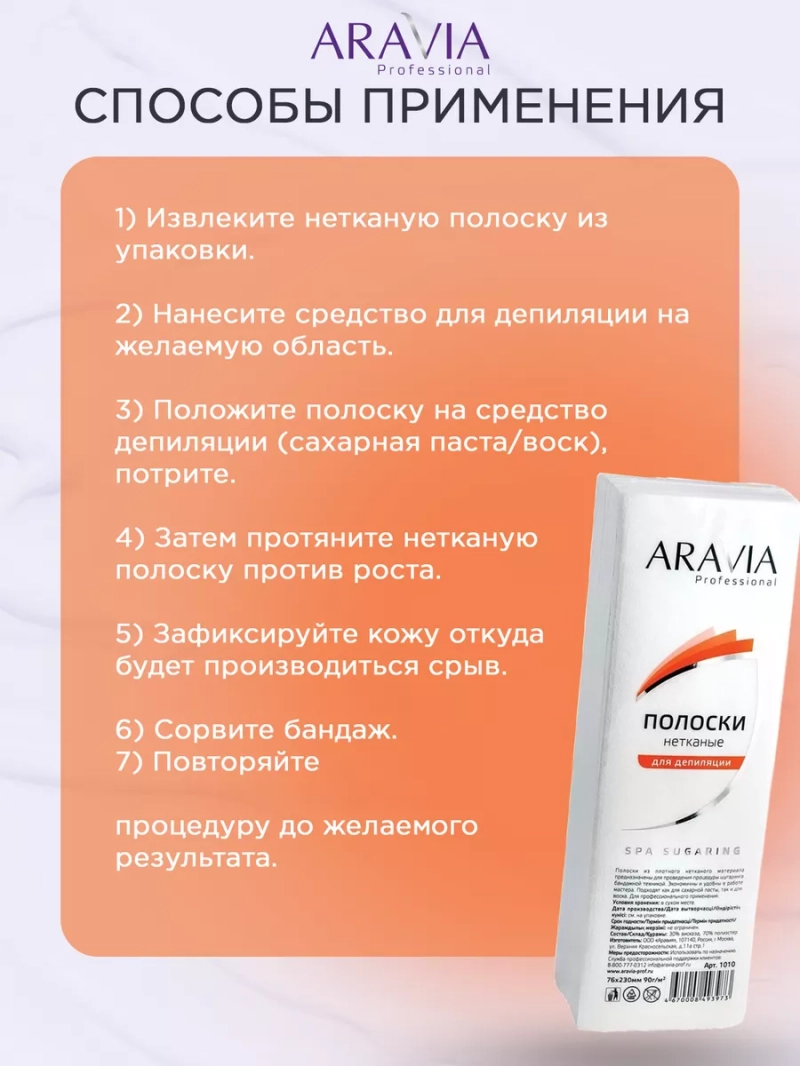 ПОЛОСКИ НЕТКАНЫЕ ДЛЯ ДЕПИЛЯЦИИ, 100 ШТ/УП. Полоски из плотного нетканого материала предназначены для проведения процедуры шугаринга бандажной техникой. Экономичны и удобны в работе мастера. Подходят для работы как сахарной пастой, так и воском. Назначение: удаление нежелательных волос. Рекомендации для использования: для профессионального использования. Размер полосок: 7,6×23 см, 90 г/см. СПОСОБ ПРИМЕНЕНИЯ: Извлеките нетканую полоску из упаковки. Нанесите средство для депиляции на желаемую область. Положите полоску на средство депиляции (сахарная паста/воск), потрите. Затем протяните нетканую полоску против роста. Зафиксируйте кожу откуда будет производиться срыв. Сорвите бандаж. Повторяйте процедуру до желаемого результата.