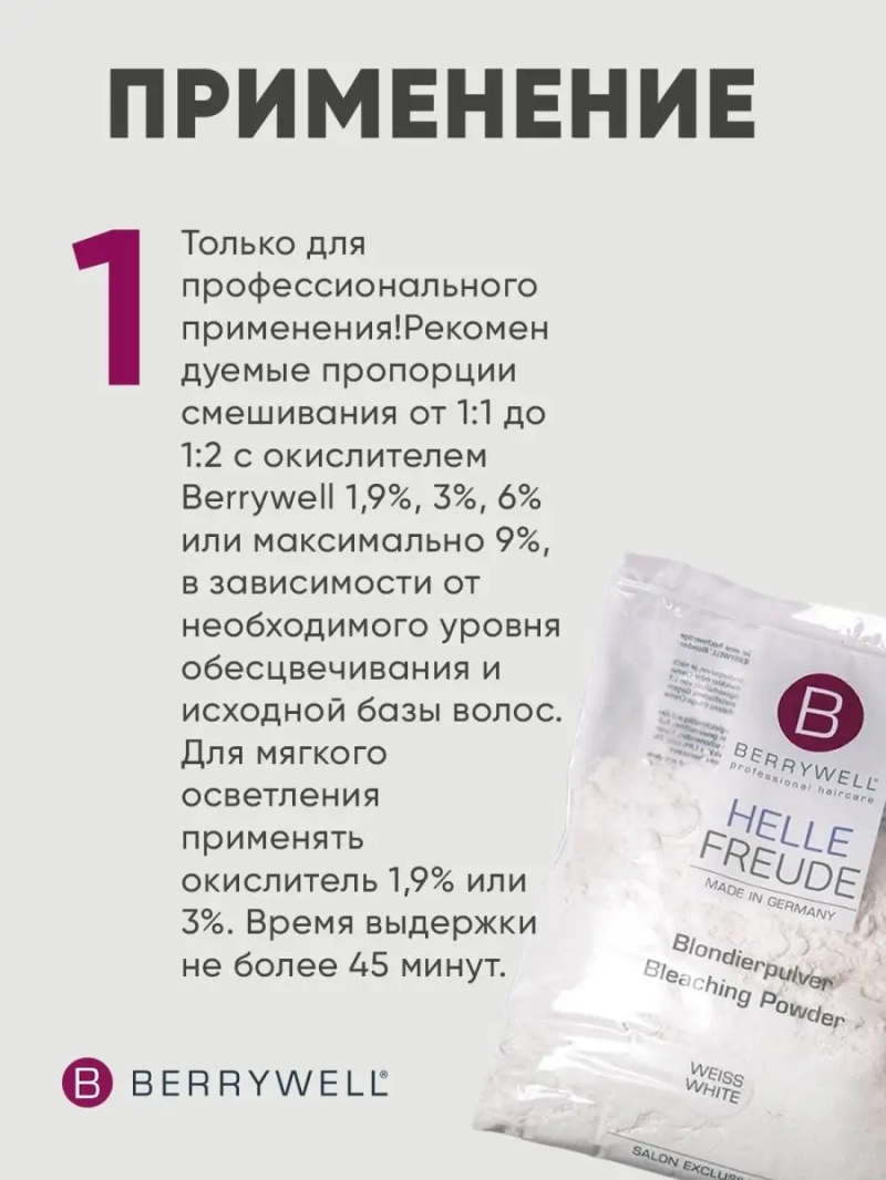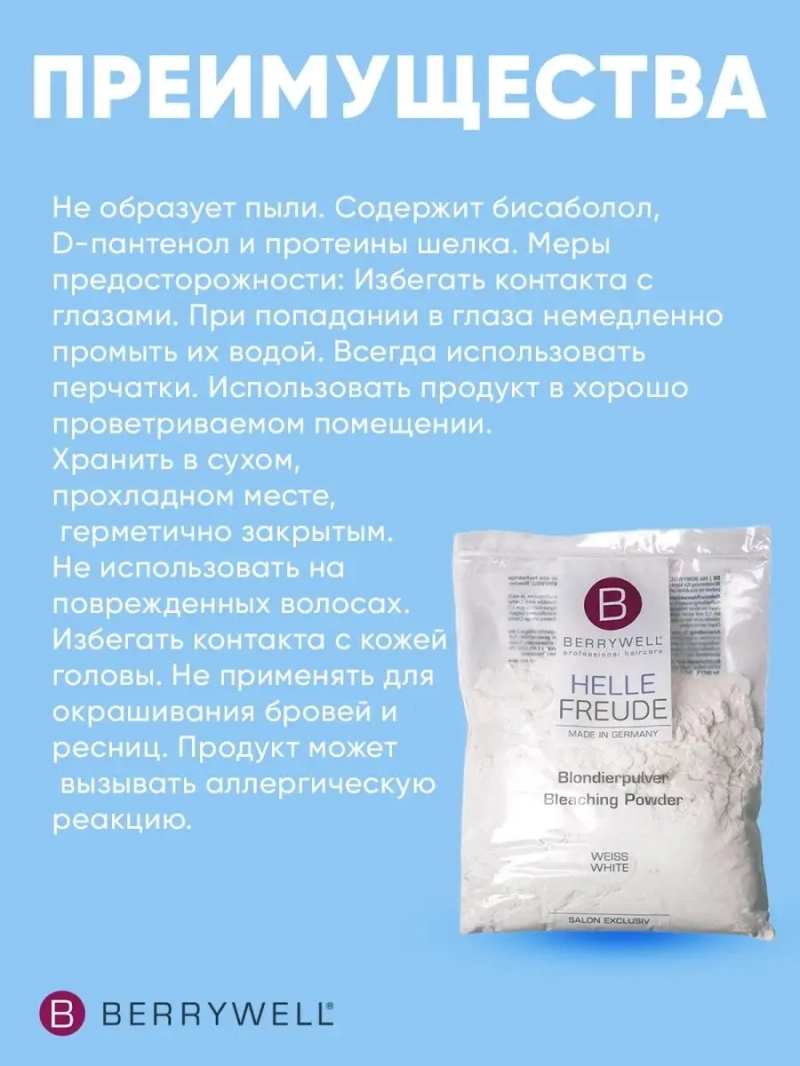 Порошок осветляющий Bleaching Powder White. Серия продуктов hellefreude дарит радость и восхищение от чистого результата осветления. С продуктом ПОРОШОК ОСВЕТЛЯЮЩИЙ BERRYWELL серии hellefreude Вы получаете высококачественный продукт для осветления волос с добавлением компонентов Bisabolol, Протеины шелка и D-Пантенол для получения чистых светлых тонов с бриллиантовым блеском. Продукт не пылит и предлагает осветление до 7 тонов. Способ применения: смешайте ПОРОШОК ОСВЕТЛЯЮЩИЙ BERRYWELL с необходимым окислителем BERRYWELL до однородной консистенции в зависимости от желаемого эффекта осветления. Мы рекомендуем пропорции от 1:1 до 1:2 с максимально 9% окислителем. Не используйте металлические предметы для смешивания или нанесения. При контакте с кожей использовать максимально 6% окислитель. Нанесение: нанести готовый продукт равномерно на сухие, немытые волосы. Не превышать максимальное время воздействия 45 минут. Для ухаживающего эффекта рекомендуем использовать окислитель 1,9% и 3%. Не превышать время воздействия и не использовать дополнительное тепло! После воздействия: после истечения времени воздействия тщательно промыть волосы водой и далее вымыть волосы шампунем Шампунь для защиты цвета Color Protection Shampoo plus серии leuchtgenuss. Для окончания процедуры рекомендуем использовать Ополаскиватель для волос Acid Rinse + серии basispflege или Маска для защиты цвета волос Color Protection Mask + серии leuchtgenuss. Меры предосторожности: Только для профессионального использования. Использовать перчатки. Не использовать для ресниц и бровей. Избегать контакта с глазами и кожей. В случае контакта с глазами сразу промыть чистой водой! Обратиться к врачу. Хранить в недоступном для детей месте. Не делать завивку и распрямление сразу после осветления продуктом! Не использовать на раздраженной, поврежденной и чувствительной коже головы. Хранить в прохладном сухом месте.
