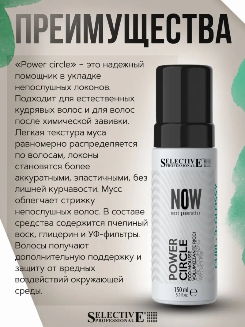 Selective Professional мусс Power Circle для придания энергии локонам, 150 мл, 1000 г. Мусс облегчает укладку вьющихся волос, дарит им привлекательность, силу и энергию. Он убирает излишнюю курчавость, помогает легко осуществлять стрижку. Средство хорошо защищает волосяной покров от ультрафиолетового воздействия. Локоны, особенно тонкие, получают силу независимо от того, натуральные они или после химической завивки. Результат: ухоженные и красивые локоны. Способ применения: нанесите объем Power Circle от двух нажатий на чуть подсушенные полотенцем волосы. Для сушки можно выбрать диффузор или дождаться естественного высыхания.