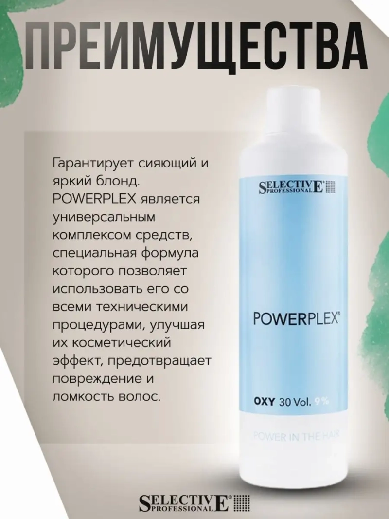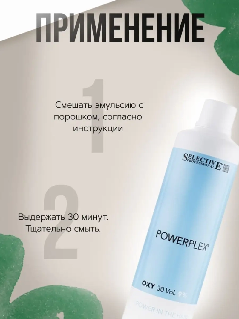 Окисляющая эмульсия Powerplex, 9%, 1000 мл. Средство содержит инновационные запатентованные молекулы природного происхождения, которые увеличивают сопротивление растяжению, повышают эластичность, предотвращают механическое повреждение волос. В состав также входит пигмент, устраняющий жёлтые оттенки. Способ применения: стандартная пропорция: Powerplex Bleaching Powder + Powerplex Oxy 1:2. Индивидуальная пропорция: 1:1 или 1:1.5 в зависимости от желаемой консистенции и используемой техники. Максимальное время выдержки 45 минут. Применяется только с порошоком обесцвечивающим Powerplex. Состав: AQUA, HYDROGEN PEROXIDE, CETEARYL ALCOHOL, PEG-40 HYDROGENATED CASTOR OIL, PARAFFINUM LIQUIDUM, CETRIMONIUM CHLORIDE, SODIUM METHYLPARABEN, PHOSPHORIC ACID, ETIDRONIC ACID, PEG-10 SOY STEROL, PEG-2 DIMEADOWFOAM AMIDOETHYLMONIUM METHOSULFATE, ACID VIOLET 43, OXYQUINOLINE SULFATE, HEXYLENE GLYCOL.
