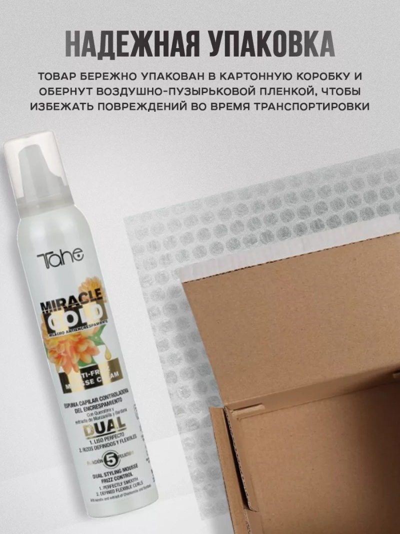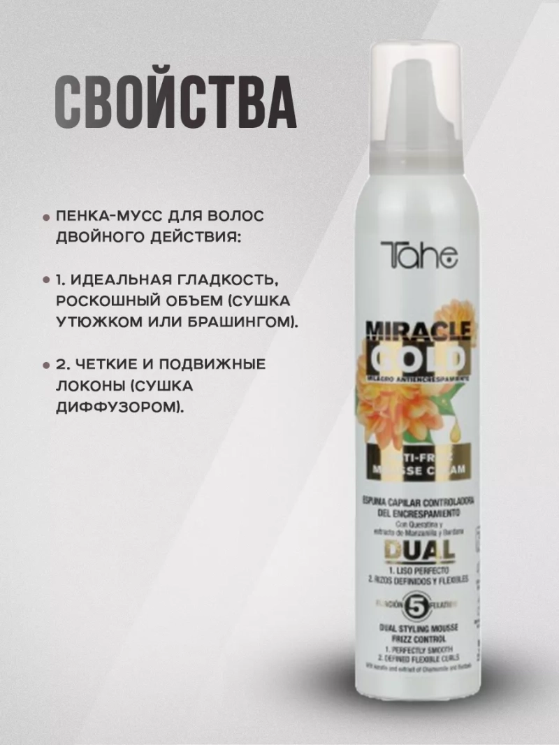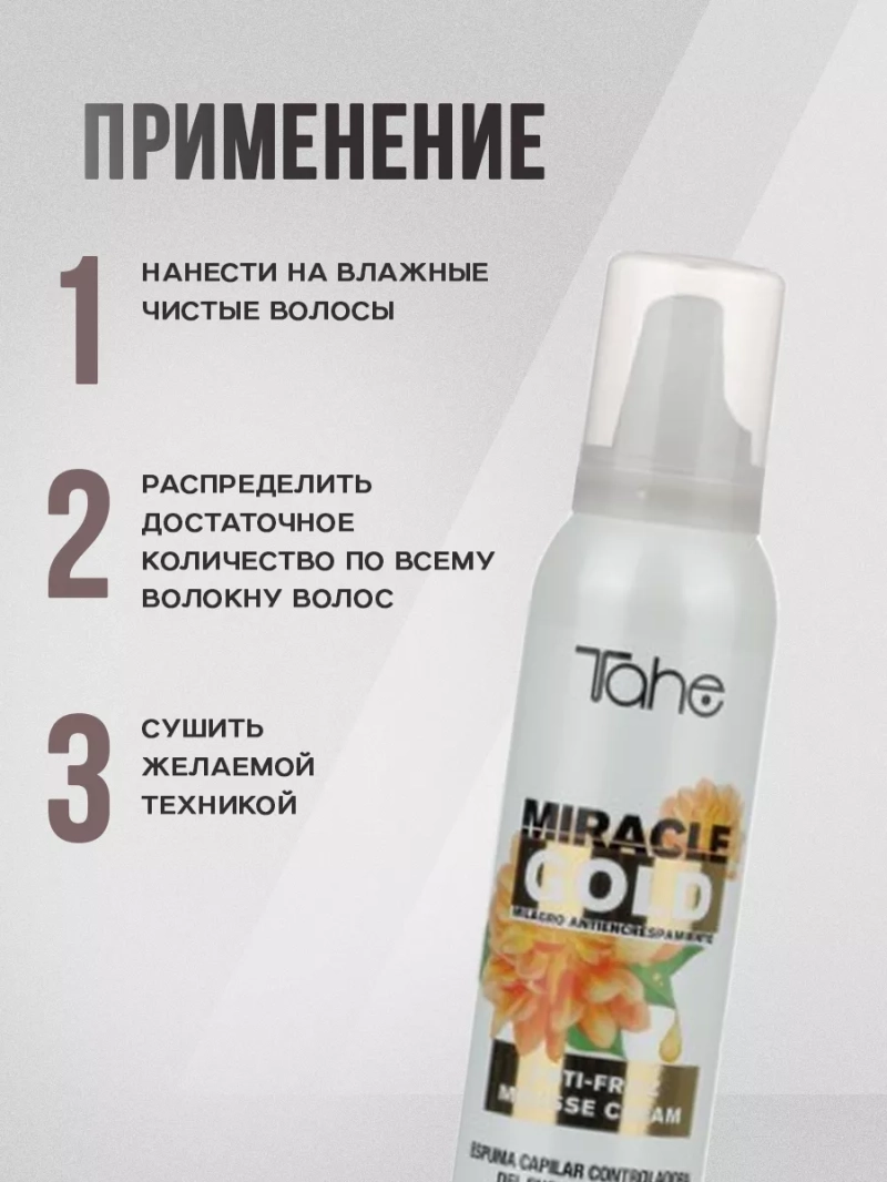 Хотите, чтобы ваша прическа всегда выглядела идеально, несмотря на погоду и влажность? Тогда Miracle Gold Anti-Frizz Mousse от бренда Tahe отлично подойдет для вас! Бренд Тахэ - это испанская профессиональная косметика премиум класса, которая поможет Вам сделать пряди крепкими, объемными и шелковистыми. Уникальная пенка для волос обеспечивает надежную защиту от пушистости и придает вашим локонам здоровый блеск и мягкость. Одной из особенностей питательной пенки для придания объема является ее легкая текстура, которая не утяжеляет волосы и не делает их жирными. Благодаря инновационной формуле, профессиональная пенка моментально впитывается в волосы, при этом не оставляя следов или ощущения липкости.Также увлажняющая пенка для фиксации волос обладает уникальными свойствами защиты от тепла и ультрафиолетовых лучей, что делает ее идеальным выбором для использования перед укладкой с помощью фена или утюжка. Каждая прядь будет надежно защищена от вредного воздействия тепла, сохраняя свою красоту и здоровье.Кроме того, пенка-мусс содержит уникальный комплекс активных ингредиентов, которые питают и увлажняют волосы изнутри. Мусс для сухих волос помогает предотвратить сечение кончиков, сохранить естественную эластичность и шелковистость волос. В результате вы получите ухоженные, здоровые волосы, которые всегда будут выглядеть привлекательно.Сочетание эксклюзивных ингредиентов мусс пенки стайлинг для непослушных волос позволяет действовать на молекулярном уровне, реструктурируя волосы и придавая им дополнительный объем и упругость.Восстанавливающая пенка для кончиков волос придает стойкость и уплотненяет тонкие волосы. При этом разглаживающий мусс не содержит агрессивных химических компонентов, парабенов или сульфатов, что делает безопасным для использования даже на тонких и поврежденных волосах.Не упустите возможность приобрести Miracle Gold Anti-Frizz Mousse уже сегодня и насладиться идеальной прической каждый день!