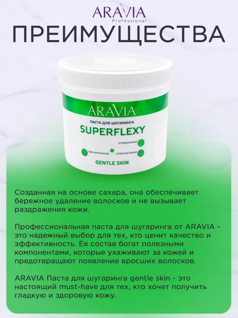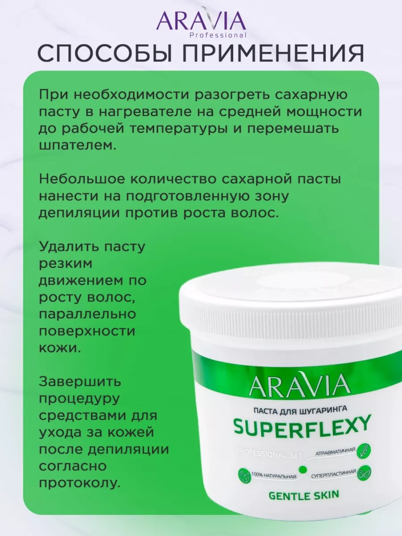 ARAVIA Паста для шугаринга gentle skin - это мягкая и универсальная паста, которая идеально подходит для бикини, лица и других чувствительных зон. Созданная на основе сахара, она обеспечивает бережное удаление волосков и не вызывает раздражения кожи. Профессиональная паста для шугаринга от ARAVIA - это надежный выбор для тех, кто ценит качество и эффективность. Ее состав богат полезными компонентами, которые ухаживают за кожей и предотвращают появление вросших волосков. ARAVIA Паста для шугаринга gentle skin - это настоящий must-have для тех, кто хочет получить гладкую и здоровую кожу. С ее помощью Вы сможете легко и быстро удалить волоски в любой зоне тела, не оставляя следов раздражения и покраснения. Способ применения: при необходимости разогреть сахарную пасту в нагревателе на средней мощности до рабочей температуры и перемещать шпателем. Небольшое количество сахарной пасты нанести на подготовленную зону депиляции против роста волос. Удалить пасту резким движением по росту волос, параллельно поверхности кожи. Завершить процедуру средства после депиляции согласно протоколу. Не упустите возможность приобрести профессиональную пасту для шугаринга ARAVIA! Этот продукт станет надежным помощником в борьбе за красоту и здоровье кожи. Закажите пасту для шугаринга gentle skin прямо сейчас и наслаждайтесь ее мягким и бережным действием каждый день!