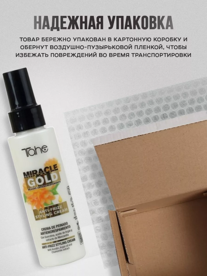 Профессиональная сыворотка для волос Miracle Gold Anti-Frizz Styling Cream от бренда Tahe станет Вашим надежным помощником в борьбе с непослушными локонами, придавая им гладкость, блеск и здоровый вид.Бренд Тахэ - это испанская профессиональная косметика премиум класса, которая поможет Вам сделать пряди крепкими, объемными и шелковистыми.Уникальная формула несмываемой сыворотки разработана специально для борьбы с фризом. Крем несмывашка обладает легкой текстурой, которая мгновенно впитывается в волосы, не утяжеляя их, и создает невидимую защитную пленку, предотвращающую появление неприятного пушистого эффекта. Увлажняющая сыворотка идеальна для запечатывания секущихся кончиков волос. Кроме того, питательная пшикалка содержит ценные натуральные ингредиенты, такие как масло арганы и экстракт кокоса, которые питают волосы, делая их мягкими и шелковистыми. Компоненты также способствуют укреплению структуры волос, защите от вредного влияния окружающей среды и термических воздействий.Это не просто разглаживающая сыворотка для фиксации волос, это настоящий мультифункциональный продукт. Восстанавливающая сыворотка для роста подходит для всех типов волос, включая сухие, поврежденные и окрашенные. Крем для укрепления волос можно использовать как на сухих, так и на влажных, что делает универсальным средством для ухода за прической.Сыворотка для укрепления волос продукт также обладает приятным ароматом, который останется на ваших волосах на протяжении всего дня, сохраняя свежесть и чистоту. Благодаря сыворотке для увлажнения и восстановления волос, Ваша прическа будет выглядеть безупречно в любой ситуации - даже в самую жаркую погоду или в условиях высокой влажности.Позвольте своим локонам почувствовать настоящее волшебство с помощью профессиональной сыворотки с маслами прямо сейчас. Ваша красота заслуживает лучшего ухода, и Miracle Gold Anti-Frizz Styling Cream поможет вам достичь идеальных результатов. Попробуйте его сегодня и убедитесь сами!