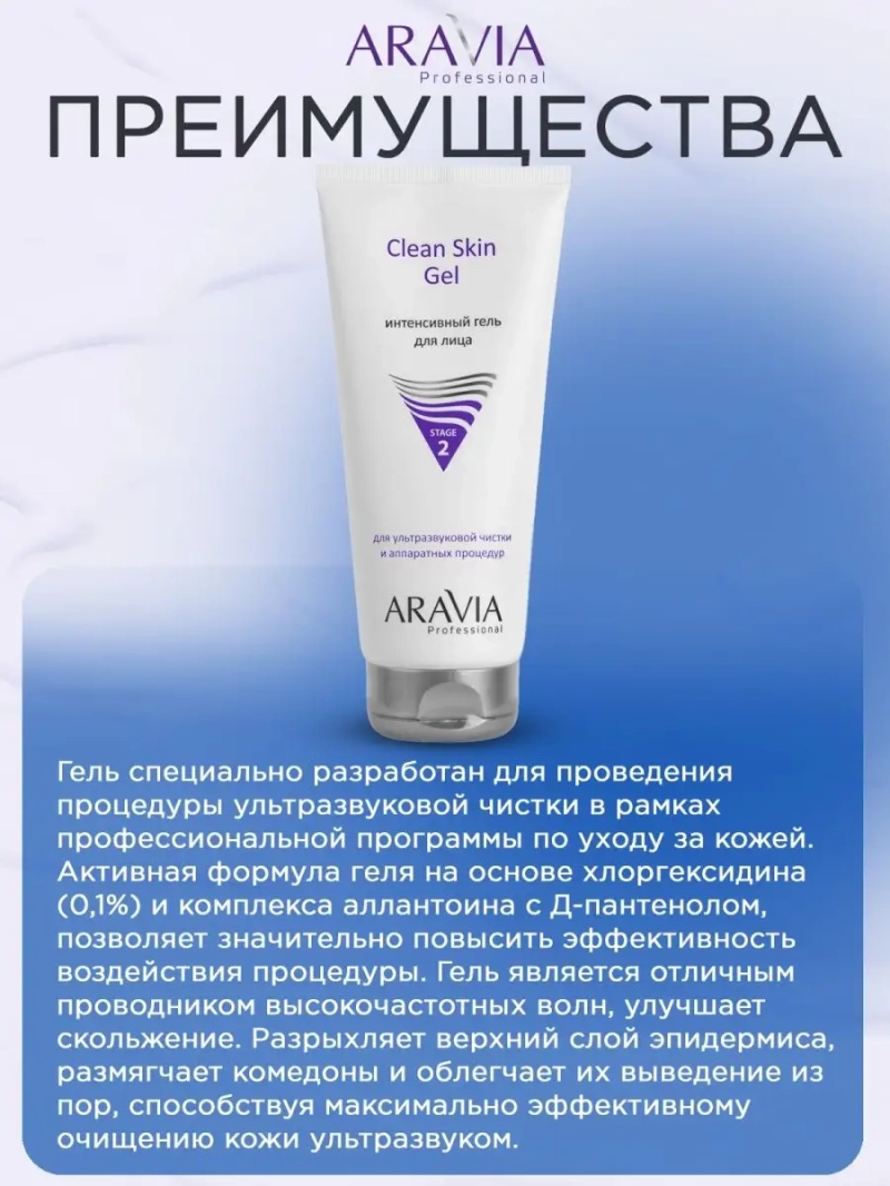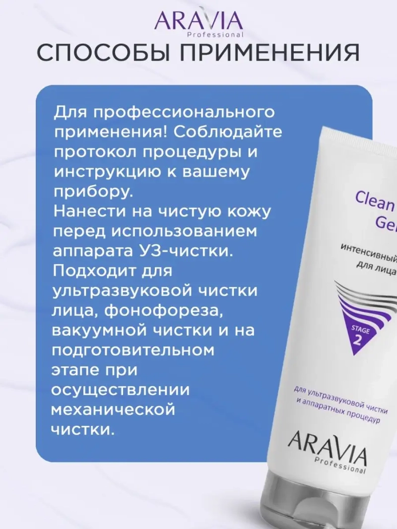 ARAVIA Гель ультразвуковой чистки лица - это инновационный продукт, который поможет вам получить идеально чистую и здоровую кожу лица. Этот токопроводящий гель для лица разработан специально для ультразвуковой чистки и обеспечивает глубокое очищение пор, удаляя загрязнения и излишки кожного жира. ARAVIA Гель для лица для ультразвуковой чистки содержит уникальные активные компоненты, которые помогают бороться с проблемами кожи, такими как акне, черные точки и пигментация. Он обладает мягким действием и не вызывает раздражения или сухости кожи. Этот гель для лица ультразвуковой чистки от Aravia является аппаратным средством для ухода за кожей, которое позволяет получить профессиональный результат в домашних условиях. Он легко наносится на кожу и обеспечивает мягкое и бережное очищение, не нарушая естественный баланс кожи. ARAVIA Гель для чистки лица ультразвуком подходит для всех типов кожи, включая чувствительную и проблемную. Он обеспечивает глубокое очищение кожи, удаляя загрязнения и излишки кожного жира, а также улучшает микроциркуляцию крови и стимулирует обменные процессы в клетках кожи. Соблюдайте протокол процедуры и инструкцию к вашему прибору. Нанести на чистую кожу перед использованием аппарата УЗ-чистки. Подходит для ультразвуковой чистки лица, фонофореза, вакуумной чистки и на подготовительном этапе при осуществлении механической чистки. Примечание: не наносить на повреждённую кожу. Во избежание индивидуальной непереносимости компонентов перед применением тестировать на маленьком участке кожи. Если вы хотите получить идеально чистую и здоровую кожу лица, то ARAVIA Гель ультразвуковой чистки лица - это именно то, что вам нужно. Он обеспечит вашей коже все необходимое для здоровья и красоты, делая ее более свежей, гладкой и сияющей. Попробуйте его уже сегодня и оцените его эффективность!