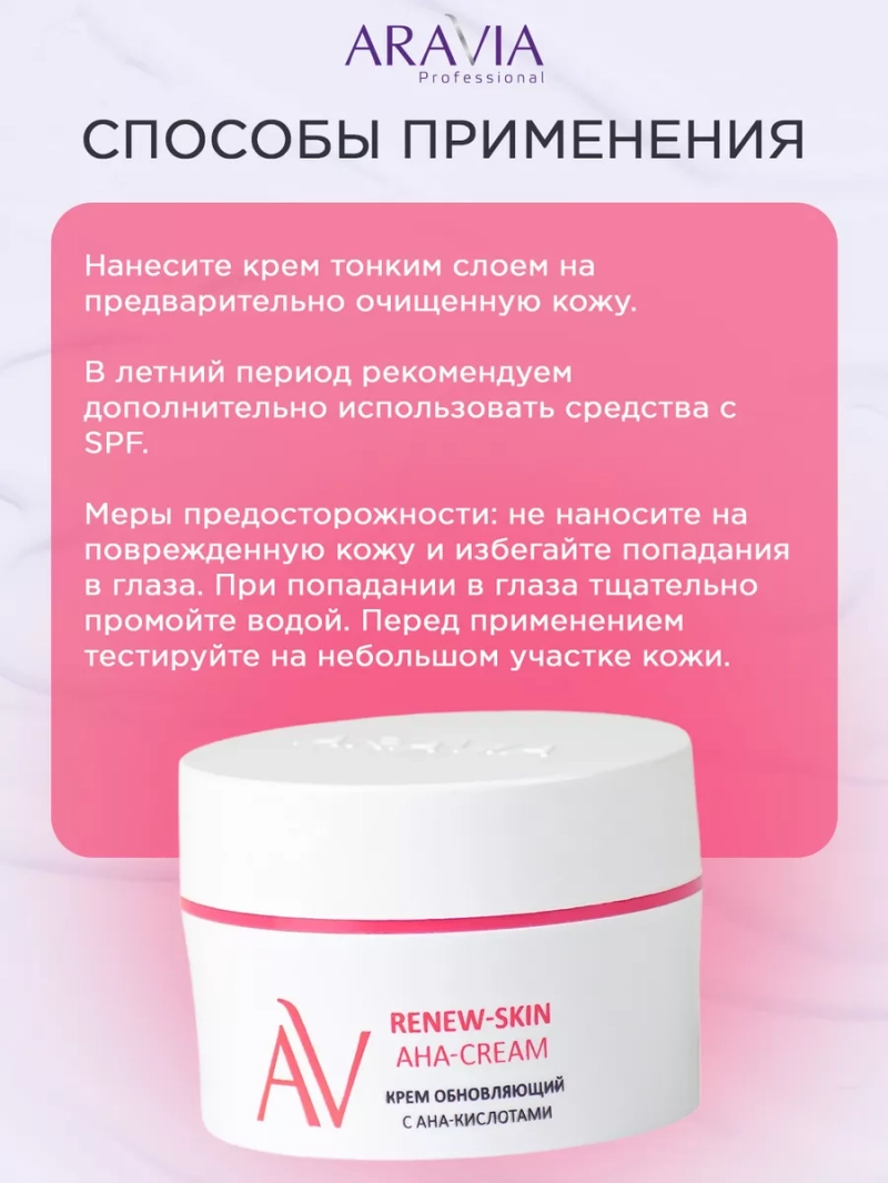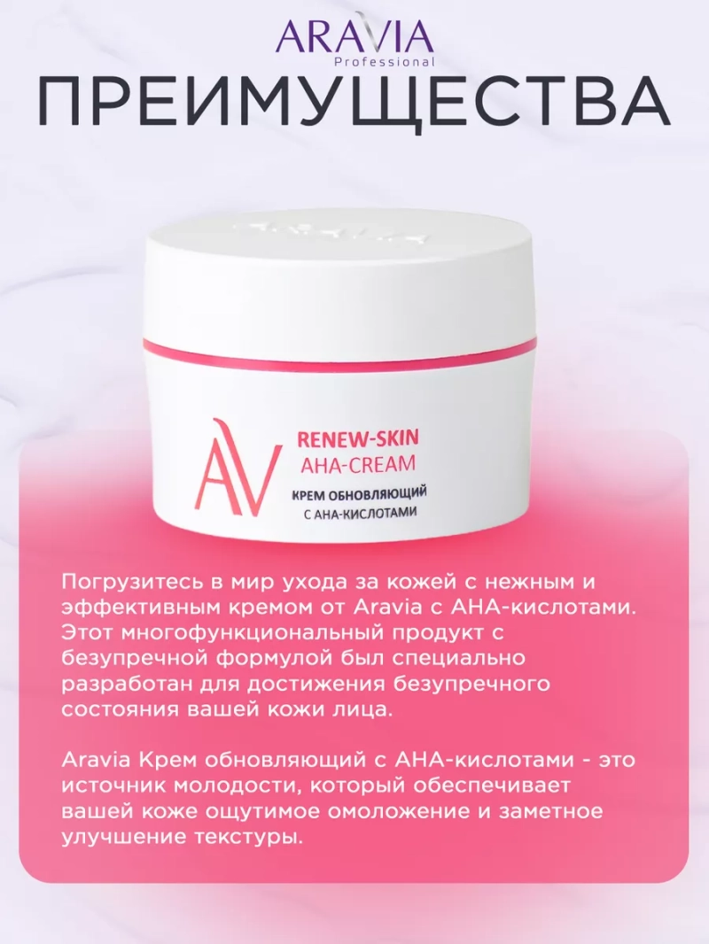 Погрузитесь в мир ухода за кожей с нежным и эффективным кремом от Aravia с АНА-кислотами. Этот многофункциональный продукт с безупречной формулой был специально разработан для достижения безупречного состояния вашей кожи лица. Aravia Крем обновляющий с АНА-кислотами - это источник молодости, который обеспечивает вашей коже ощутимое омоложение и заметное улучшение текстуры. Он бережно и эффективно очищает кожу, придавая ей невероятное сияние и здоровый вид. Специально разработанный для сужения пор и борьбы с признаками старения, этот крем является идеальным выбором для всех типов кожи. Он содержит высокую концентрацию АНА-кислот, которые обеспечивают нежное и глубокое отшелушивание отмерших клеток, уменьшая тем самым появление морщин, рубцов и несовершенств. Aravia Крем обновляющий с АНА-кислотами - это не только эффективное средство для борьбы с признаками старения, но и надежный партнер в борьбе с проблемой расширенных пор. Его легкая текстура позволяет крему глубоко проникать в поры, сужая их и предотвращая возникновение новых несовершенств. С этим кремом вы можете быть уверены, что ваша кожа получит полный комплекс ухода, который заслуживает. Он эффективно борется с признаками старения, сужает поры, выравнивает текстуру кожи и обеспечивает непревзойденное ощущение свежести и молодости. Неотразимая косметика Aravia предлагает вам лучшее решение для красоты вашей кожи. Не упустите возможность попробовать этот невероятный крем с АНА-кислотами, чтобы достичь идеального состояния вашей кожи лица. Aravia готова помочь вам обрести уверенность и привлекательность, о которых вы всегда мечтали.