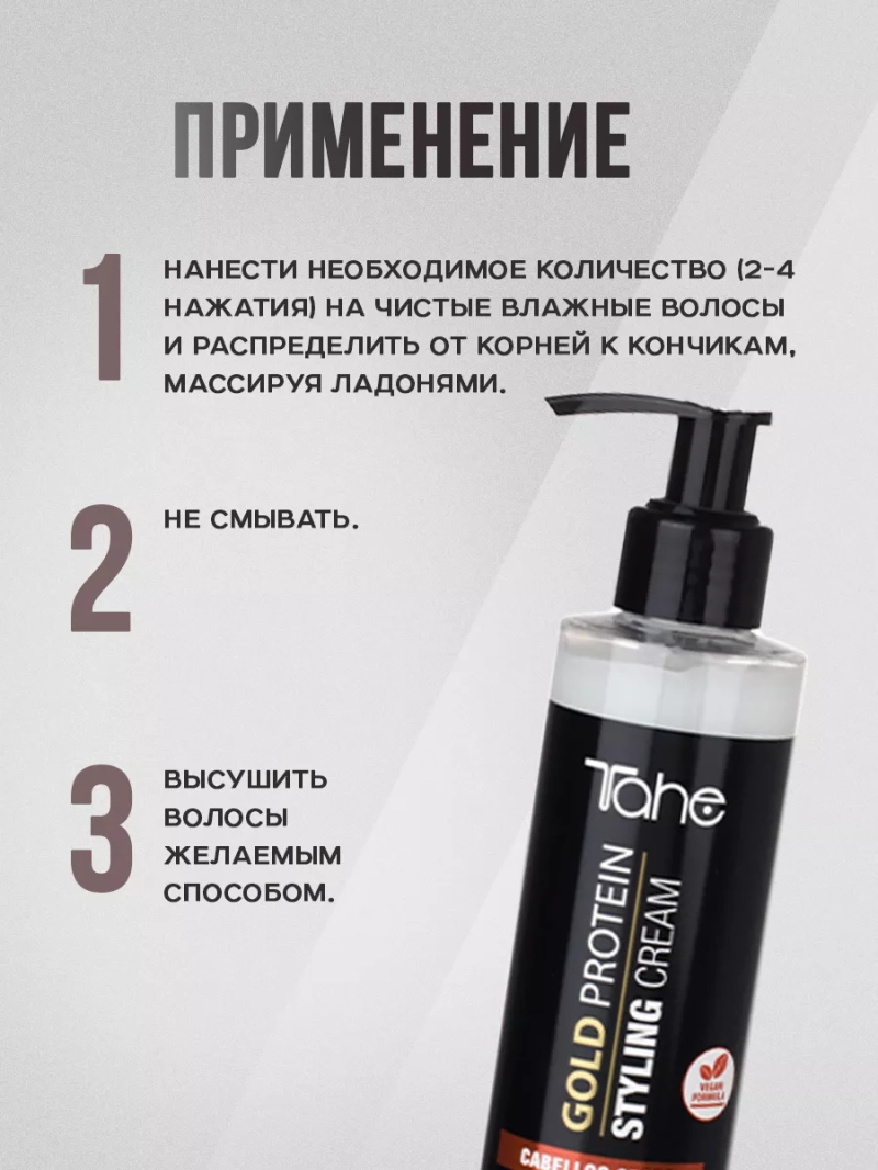 Хотите, чтобы ваши сухие волосы стали мягкими, блестящими и легко укладывались? Тогда Gold Protein Styling cream Dry hair Shine Softness от бренда Tahe - это именно то, что вам нужно! Бренд Тахэ - это испанская профессиональная косметика премиум класса, которая поможет вам сделать волосы крепкими, объемными и шелковистыми. Несмываемый крем для расчесывания сухих волос обогащен протеинами золота, которые питают и увлажняют волосы, делая их более послушными и блестящими.Специально разработанная формула увлажняющего крема спрея обеспечивает интенсивное увлажнение сухих волос, делая их более гладкими и мягкими на ощупь. Разглаживающий крем для укладки помогают укрепить структуру волос, предотвращая их ломкость и сечение. Теперь вы можете забыть о том, что ваши волосы выглядят сухими и тусклыми! Несмываемый крем уход для волос также обладает отличными укрощающими свойствами. Питательный крем несмывашка облегчает процесс укладки волос, делая его более простым и быстрым. Восстанавливающий крем для секущихся кончиков волос придает естественный блеск и шелковистость, делая их более ухоженными и привлекательными.Защитный крем с маслами для волос идеально подходит для ежедневного использования. Просто нанесите небольшое количество крема для кудрявых волос на чистые влажные локоны и равномерно распределите его по всей длине. Затем приступайте к укладке ваших волос как обычно. Вы сразу почувствуете, как каждая прядь становятся более гладкой, мягкой и блестящей.Крем для объема волос содержит в составе соевым протеин и омега-6 и 9. Благодаря этому крем для восстановления устраняет пушистость волос, сохраняет стойкость укладки. Gold Protein Styling cream Dry hair Shine Softness - это не просто крем для тонких и сухих волос, это настоящий спаситель для вашей прически! Попробуйте его прямо сейчас и убедитесь сами в его эффективности. Ваши волосы будут выглядеть превосходно каждый день!