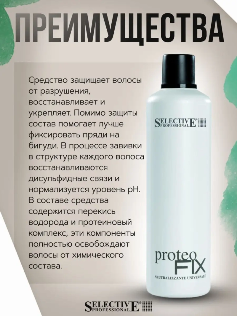 Фиксатор нейтрализующий универсальный для химической завивки / Proteo Fix 1000 мл. Полностью восстанавливает разорванные химическим составом серные связи. Фиксирует волосы в зависимости от формы бигуди и способа их накручивания. Ухаживает за волосами. Восстанавливает натуральный рН баланс кожи головы и волос. Полностью уничтожает остатки химического раствора на волосах. Состав готов к применению. Содержит перекись водорода. Для профессионального использования. Способ применения:;На смытые после химического состава волосы нанести фиксаж Proteo Fix. Выдержать 5 минут, повторить нанесение фиксажа. Затем тщательно смыть водой. Аккуратно раскрутить бигуди. Состав: AQUA, HYDROGEN PEROXIDE, MYRISTAMINE OXIDE, PHOSPHORIC ACID, SODIUM METHYLPARABEN, STEARALKONIUM CHLORIDE, ETIDRONIC ACID, STYRENE/ACRYLATES COPOLYMER, SIMETHICONE.