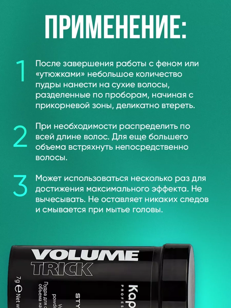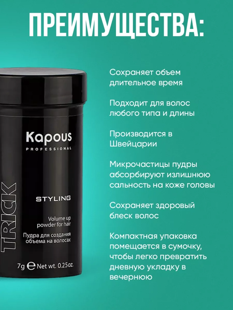 Невесомая пудра для создания объема на волосах "Volumetrick" - альтернативный стайлинг от Kapous Professional. Преимущества пудры для волос: 1) Сохраняет объем длительное время 2) Подходит для волос любого типа и длины 3) Производится в Швейцарии 4) Микрочастицы пудры абсорбируют излишнюю сальность на коже головы 5) Сохраняет здоровый блеск волос 6) Компактная упаковка помещается в сумочку, чтобы легко превратить дневную укладку в вечернюю 7) Белая пудра тает на волосах, не оставляя следов на одежде и темных волосах 8) Создает и прикорневой объем, и подчеркивает акценты в прическе держит укладку даже во влажную погоду Способ применения: после завершения работы с феном или "утюжками" небольшое количество пудры нанести на сухие волосы, разделенные по проборам, начиная с прикорневой зоны, деликатно втереть. При необходимости распределить по всей длине волос. Для еще большего объема встряхнуть непосредственно волосы. Может использоваться несколько раз для достижения максимального эффекта. Не вычесывать. Не оставляет никаких следов и смывается при мытье головы. Состав: AQUA (WATER), SILICA SILYLATE, PEG-8, UNDECANE, TRIDECANE, CARRAGEENAN, POASSIUM SORBATE, CITRIC ACID, TOCOPHEROL
