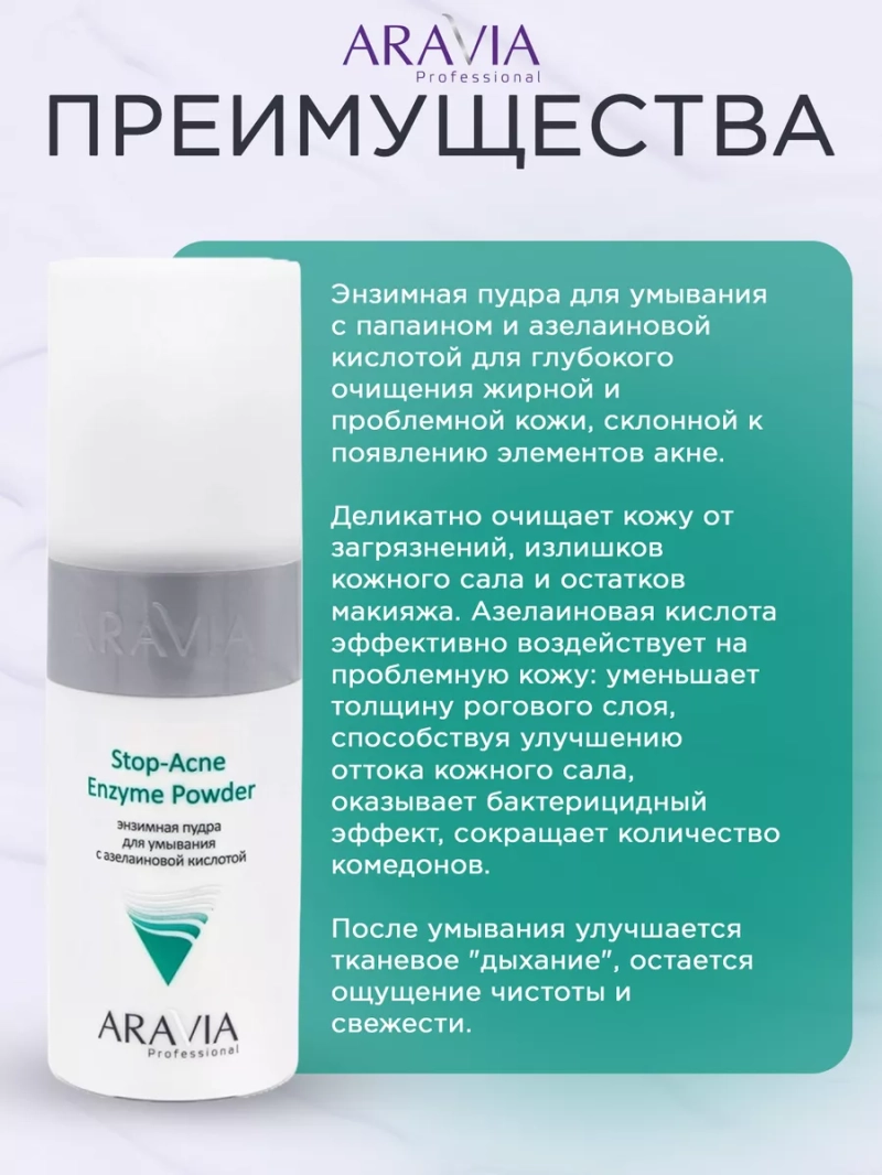 Энзимная пудра для умывания с азелаиновой кислотой. Энзимная пудра для умывания с папаином и азелаиновой кислотой для глубокого очищения жирной и проблемной кожи, склонной к появлению элементов акне. Деликатно очищает кожу от загрязнений, излишков кожного сала и остатков макияжа. Азелаиновая кислота эффективно воздействует на проблемную кожу: уменьшает толщину рогового слоя, способствуя улучшению оттока кожного сала, оказывает бактерицидный эффект, сокращает количество комедонов. После умывания улучшается тканевое "дыхание", остается ощущение чистоты и свежести, при регулярном применении уменьшается проявление несовершенств на коже. При добавлении воды пудра превращается в легкую пену, активируя действие мягкого очищающего комплекса и азелаиновой кислоты, превращая процесс умывания в настоящий ритуал красоты. Состав: (inci) disodium lauryl sulfosuccinate, papain, microcrystalline cellulose, starch, maltodextrin, hydroxypropyl methylcellulose, azelaic acid, parfume эффект: матирование, снятие воспалений, отшелушивание, от черных точек. Активный ингредиент: азелаиновая кислота. Способ применения: небольшое количество пудры насыпать в смоченную водой ладонь. Вспенить средство и массажными движениями нанести на влажную кожу лица и шеи, избегая области вокруг глаз.