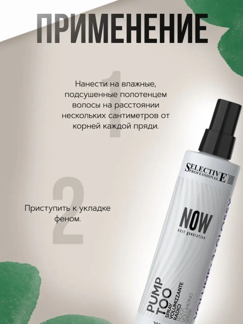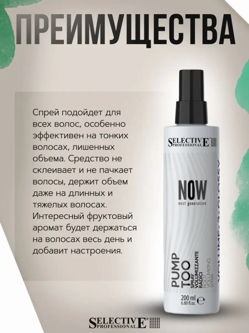 Selective Professional Спрей Now Pump Too для придания объема волосам у корней, средняя фиксация, 200 мл. Фиксирующий спрей для придания прикорневого объема Selective Professional Pump Too;позволяет одновременно решить несколько задач: продлить долговечность укладки и вернуть локонам их природную упругость и живость. Любая прическа, зафиксированная таким средством,;будет выглядеть безупречно, ведь оно не склеивает пряди, не создает эффекта грязных волос. Преимущества: Универсальный помощник для волос любого типа;Устойчивая фиксация без склеивания на 24 часа;;Содержит УФ-фильтр, защищающий пигмент от выгорания;Легко смывается любым шампунем. Способ применения: распылите с расстояния нескольких сантиметров от основания каждой пряди вымытых и подсушенных полотенцем волос. Приступите к укладке. Состав: aqua, alcohol denat., pvp, ethylhexyl dimethyl paba, peg-40 hydrogenated castor oil, parfum, cetrimonium chloride, polyquaternium-55, peg/ppg-18/18 dimethicone, panthenol, amyl cinnamal