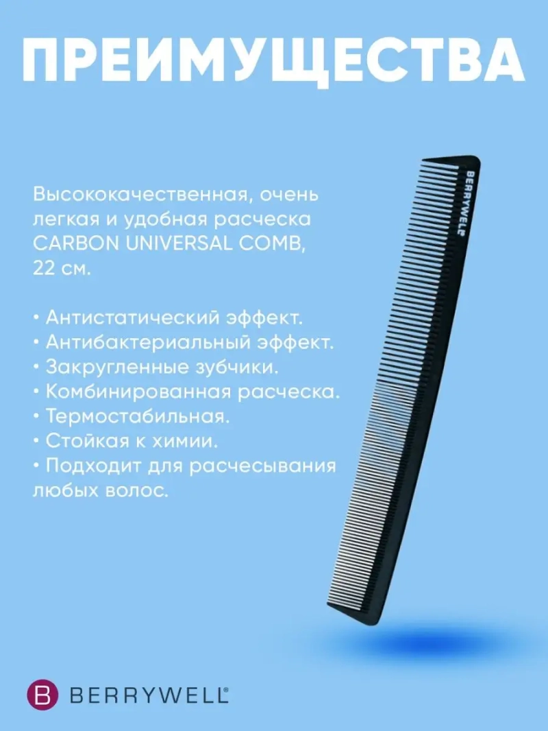 Расческа 22 см CARBON UNIVERSAL COMB. Высококачественная, очень легкая и удобная расческа. Антистатический эффект. Антибактериальный эффект. Закругленные зубчики. Комбинированная расческа. Термостабильная. Стойкая к химии. Применение: подходит для расчесывания любых волос.